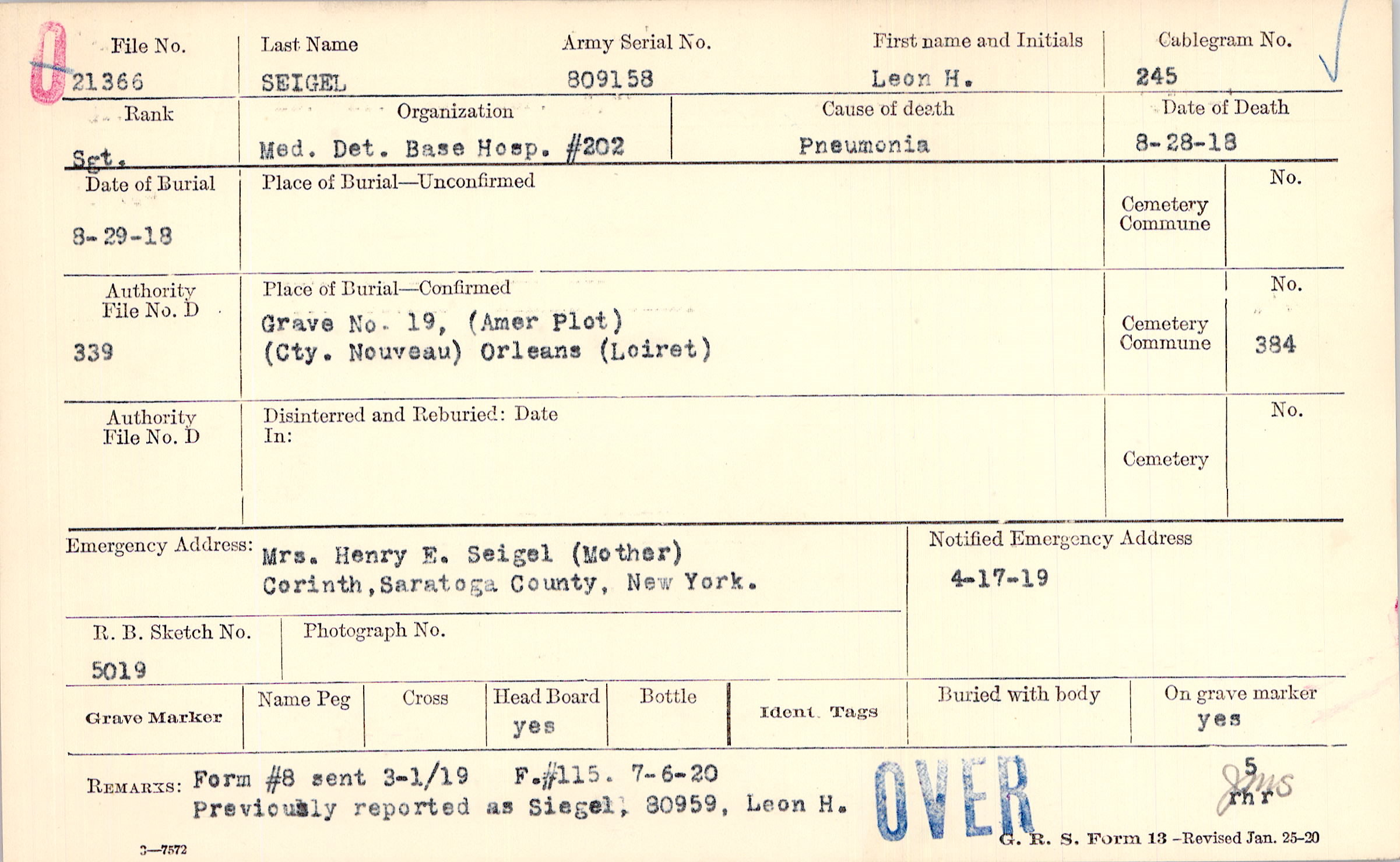 Previously reported as Siegel, 80959, Leon H., Form #8 sent 3-1/19, F.#115. 7-6-20