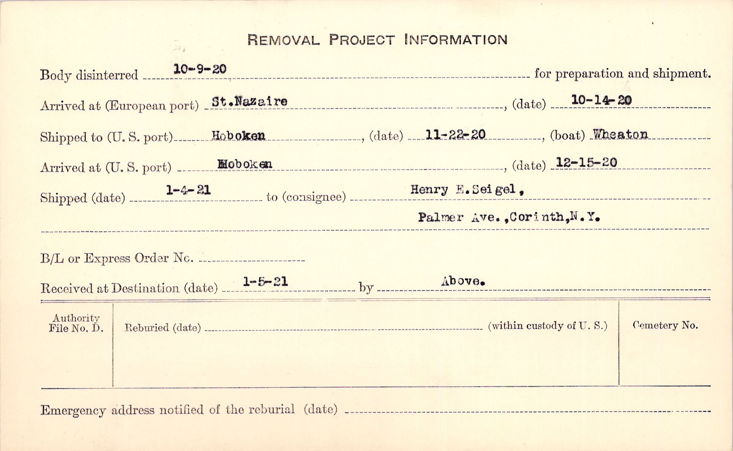 Body disinterred 10/9/1920 for preparation and shipment.