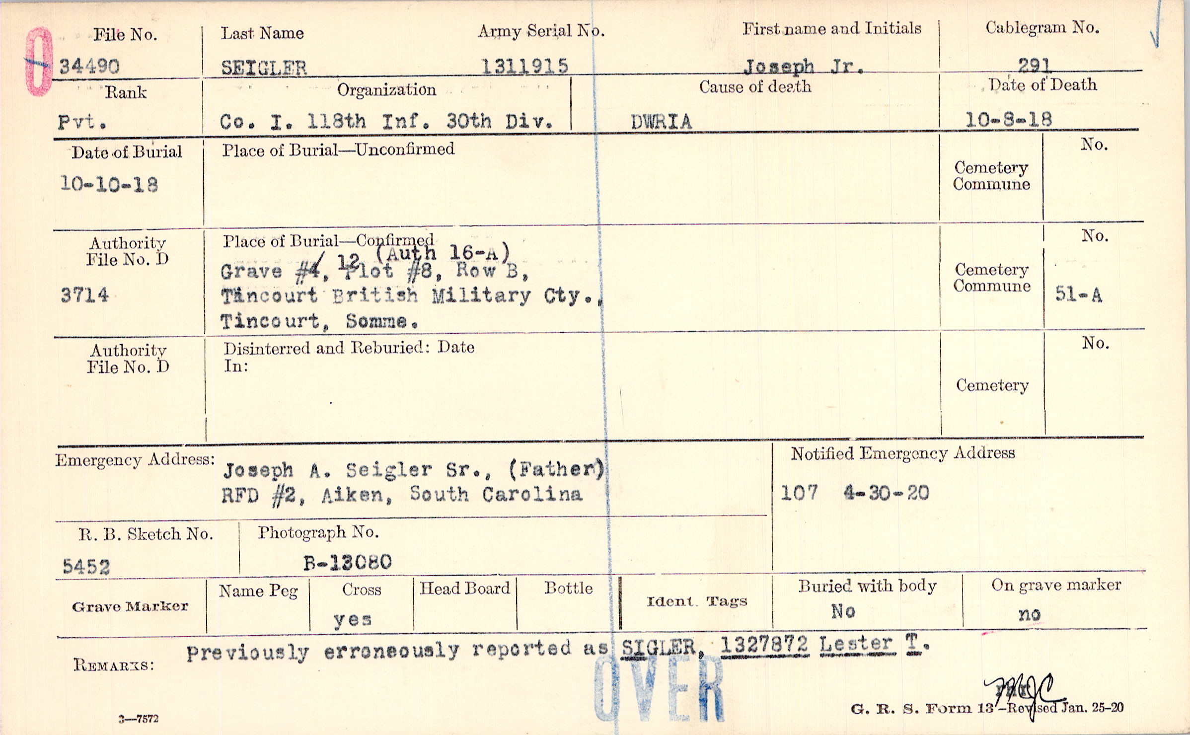 Previously erroneously reported as SIGLER, 1327872 Lester T.