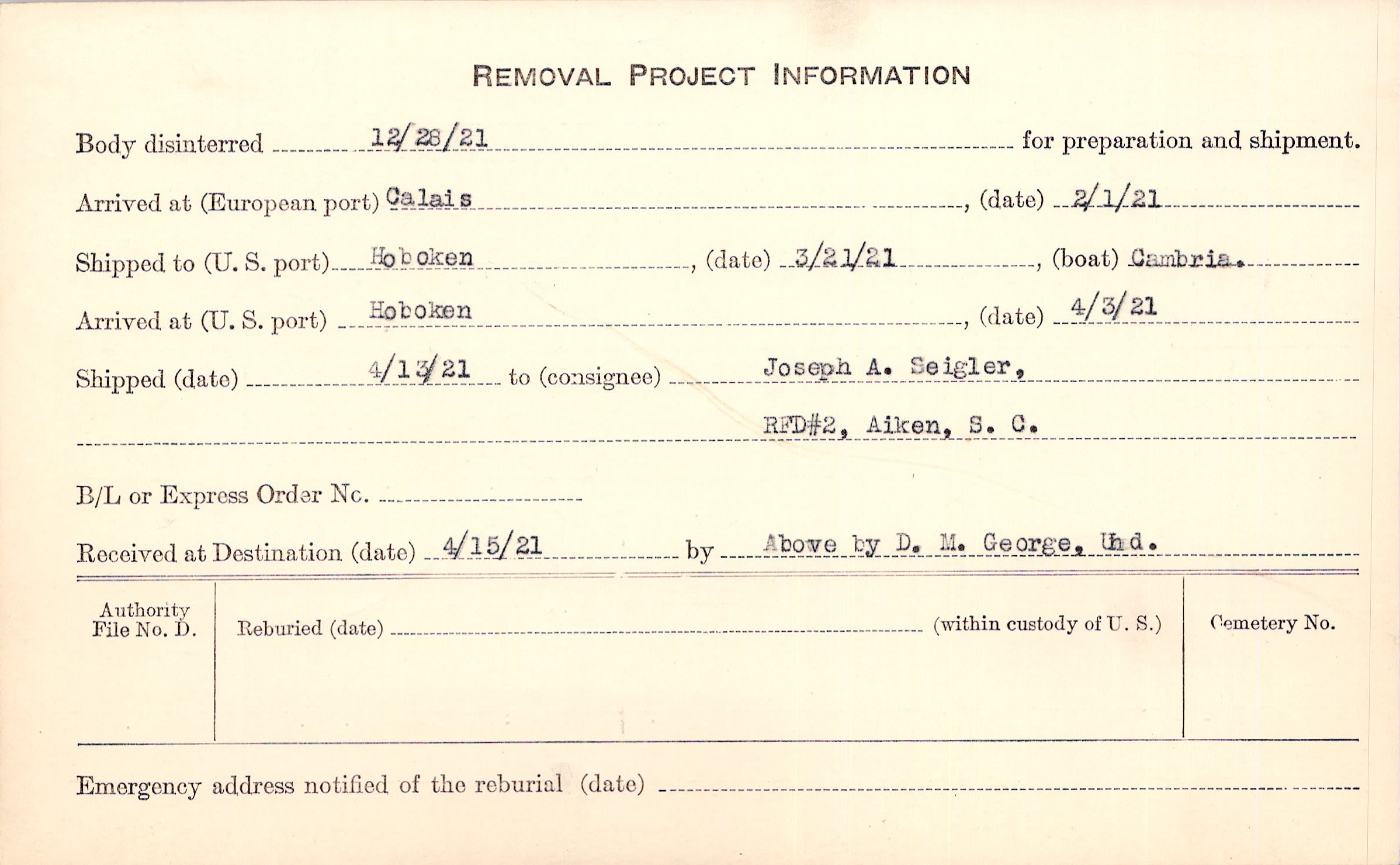 Joseph A. Seigler Sr., (Father), RFD #2, Aiken, South Carolina