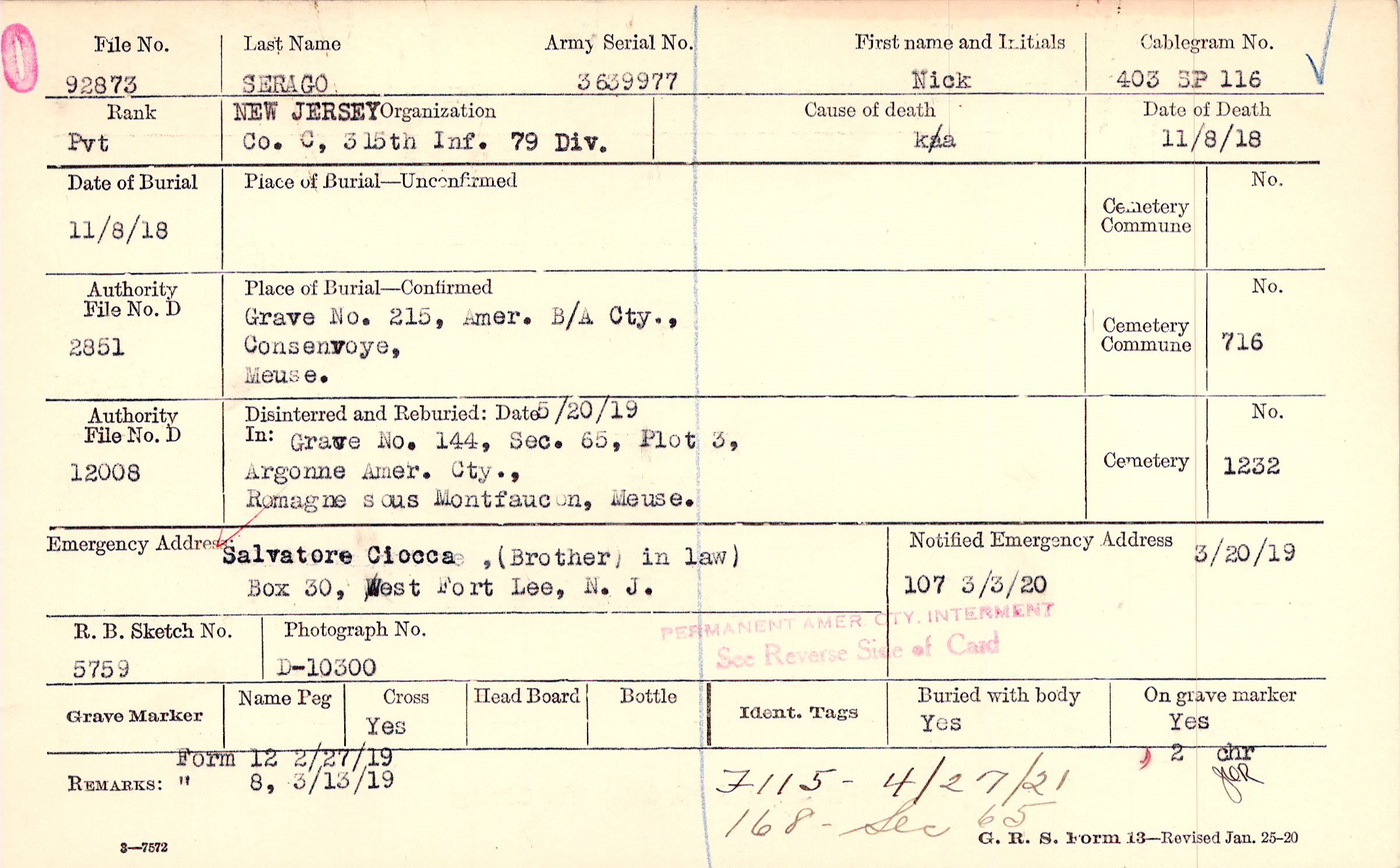 Salvatore Ciocca, (Brother) in law), Box 30, West Fort Lee, N. J.