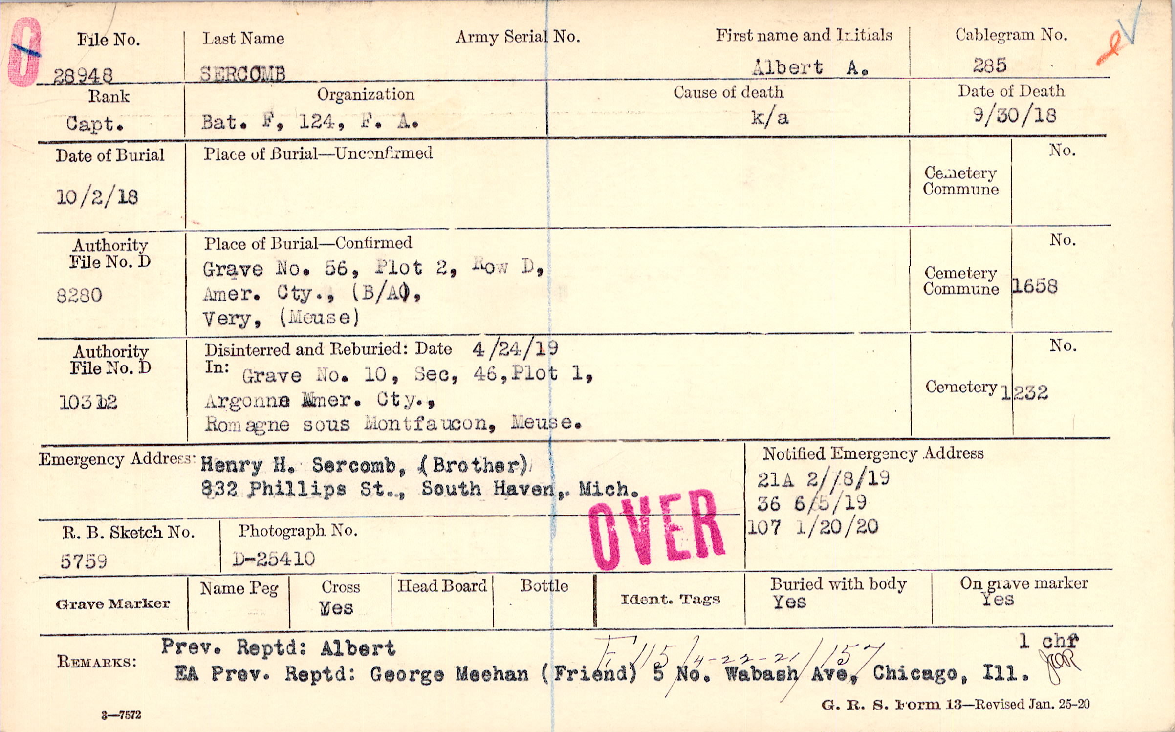 Henry H. Sercomb, (Brother), 832 Phillips St., South Haven, Mich.
