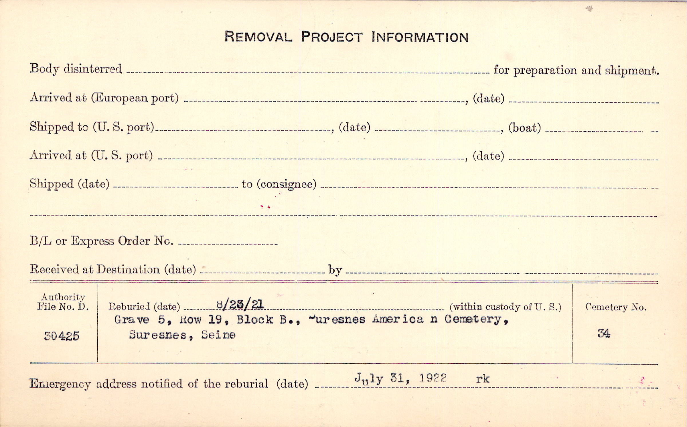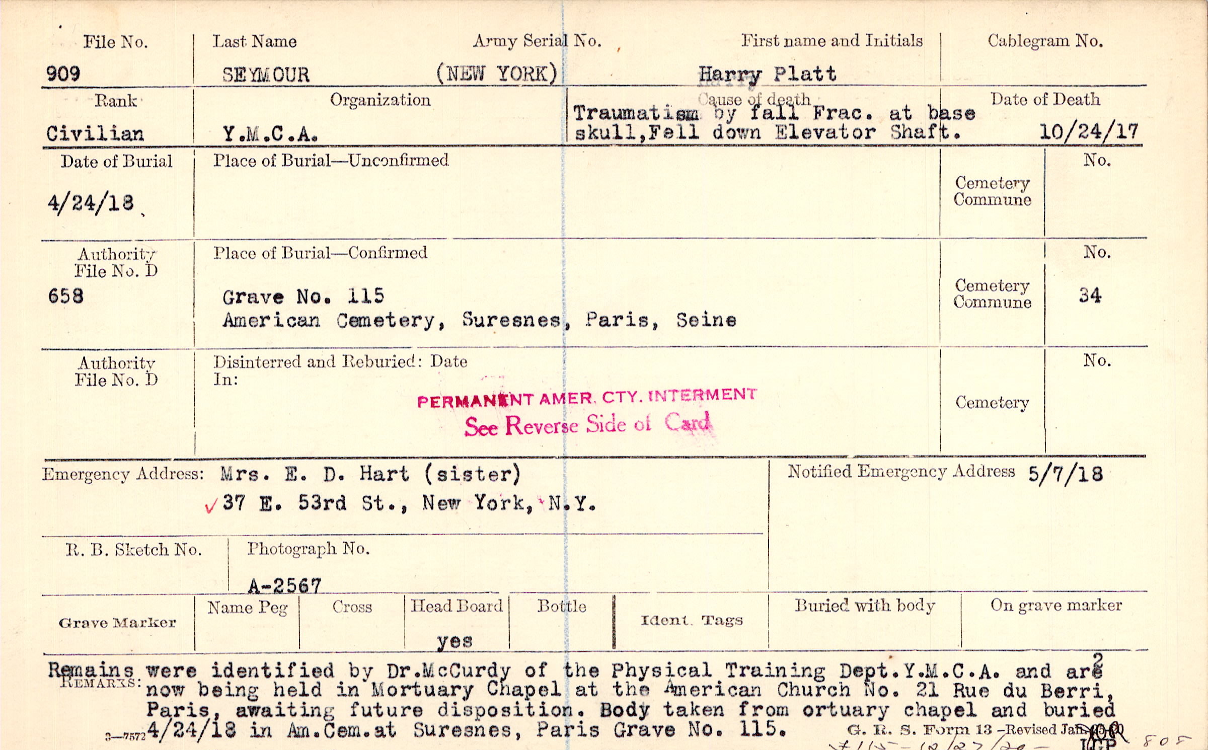 Remains were identified by Dr. McCurdy of the Physical Training Dept. Y.M.C.A. and are now being held in Mortuary Chapel at the American Church No. 21 Rue du Berri, Paris, awaiting future disposition. Body taken from mortuary chapel and buried 4/24/18 in A. Cem. at Suresnes, Paris Grave No. 115.
