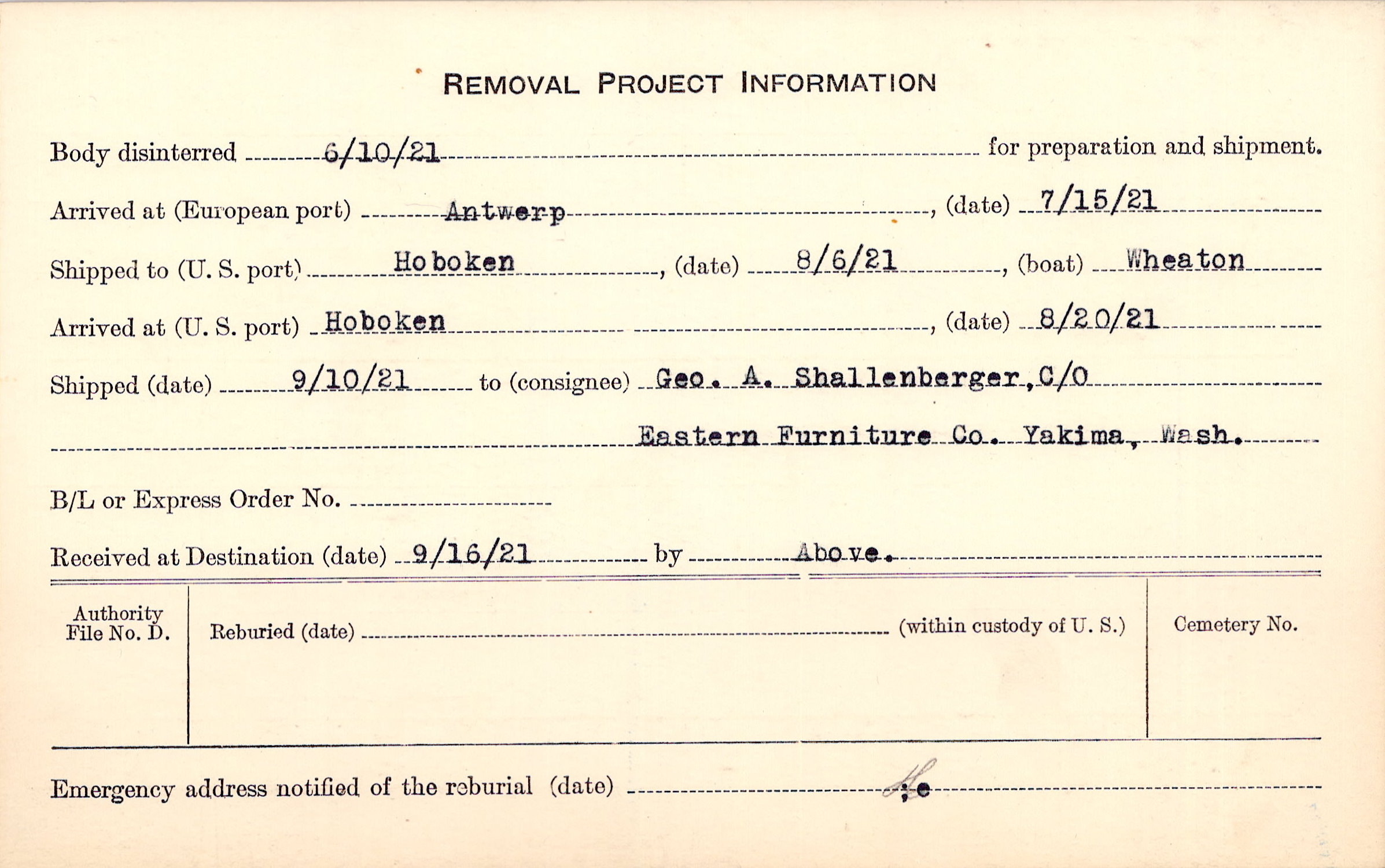 Body disinterred 6/10/1921 for preparation and shipment.
