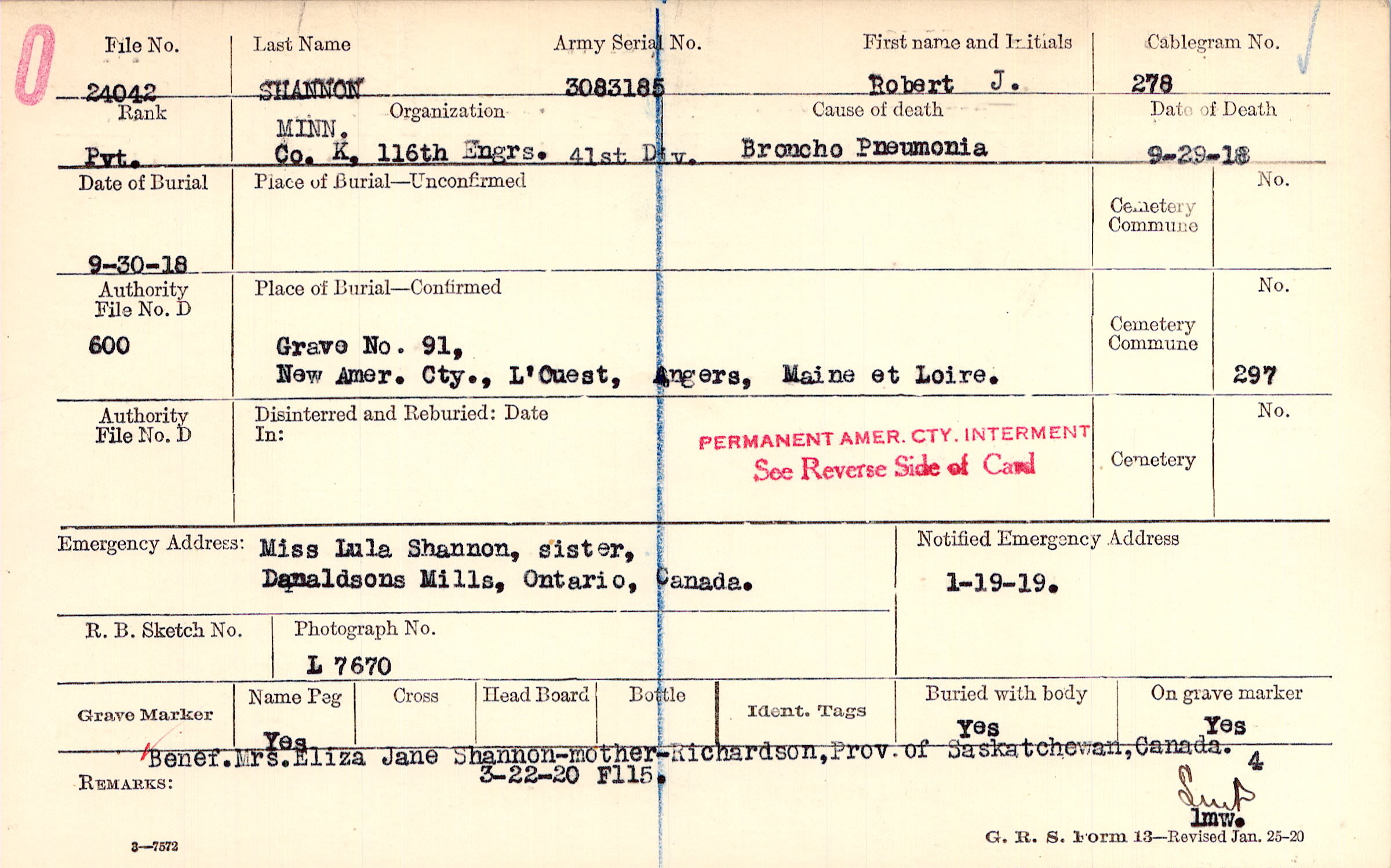 Grave 91, New Amer. Cty., L'Ouest, Angers, Maine et Loire.