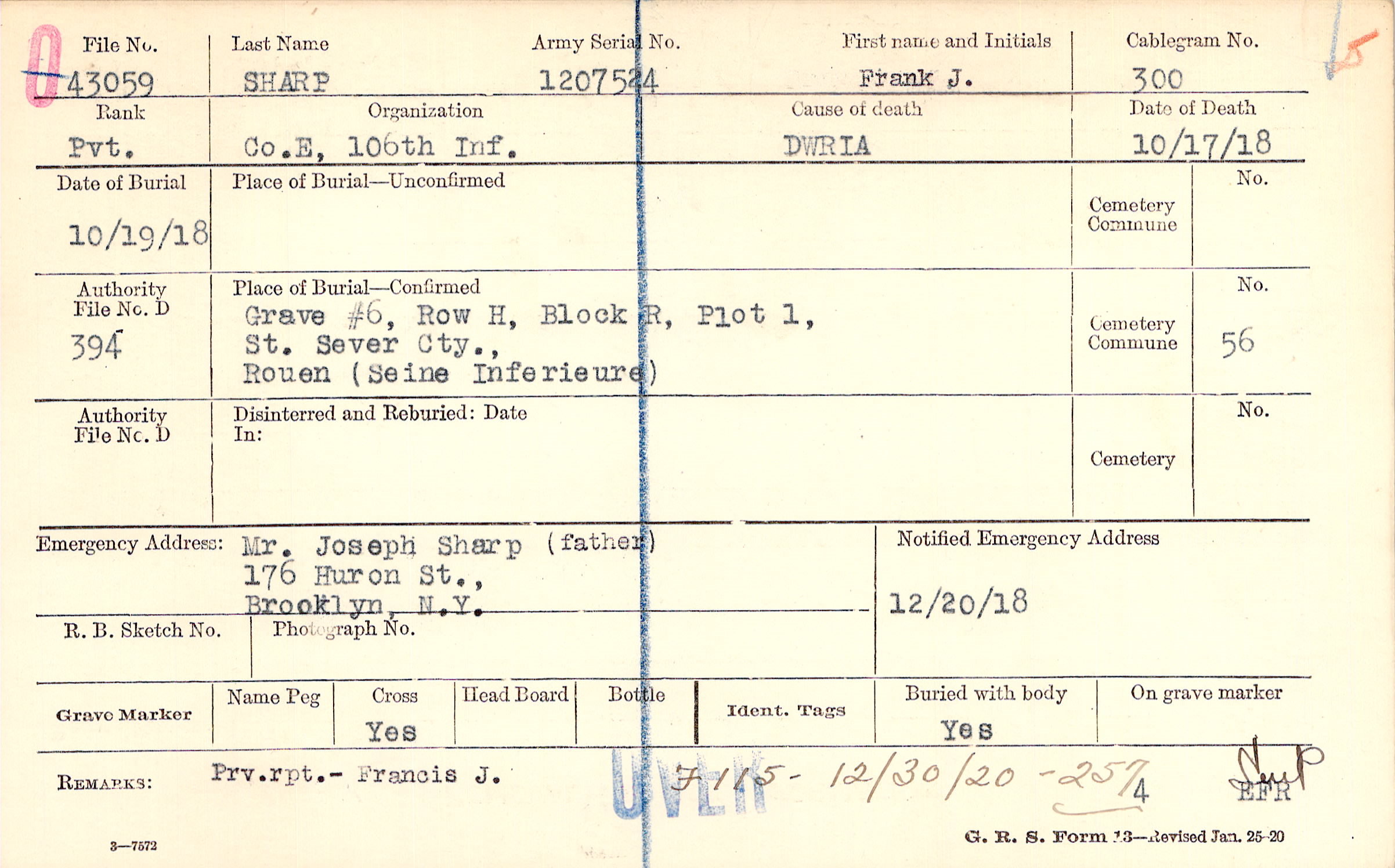 Mr. Joseph Sharp (father), 176 Huron St., Brooklyn, N.Y.