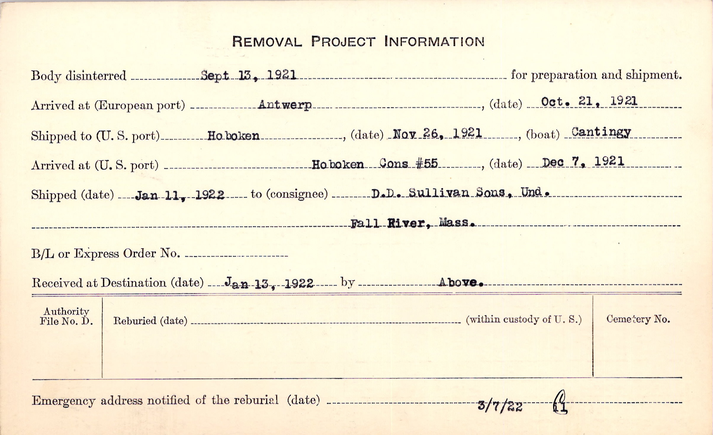 Body disinterred 9/13/1921 for preparation and shipment.