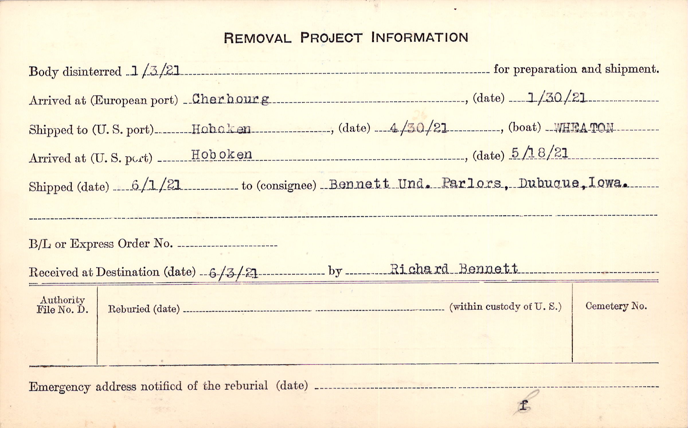Body disinterred 1/3/1921 for preparation and shipment.
