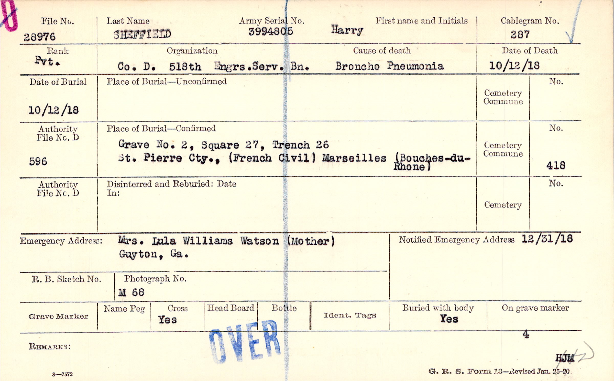 Grave 2, Square 27, Trench 26, St. Pierre Cty., (French Civil), Marseilles, (Bouches-du-Rhone)