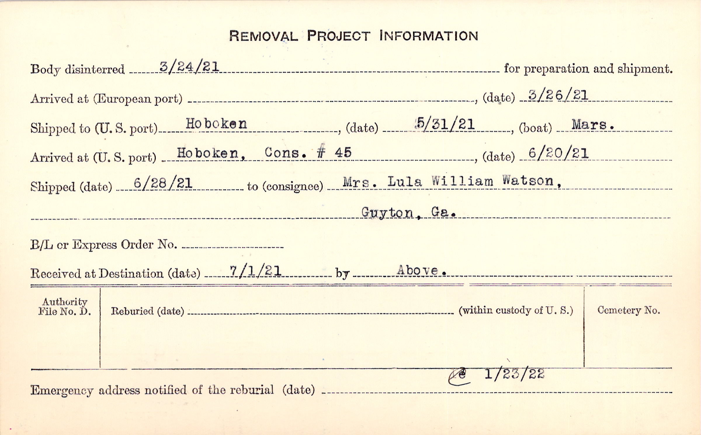 to Mrs. Lula William Watson, Guyton, Ga.