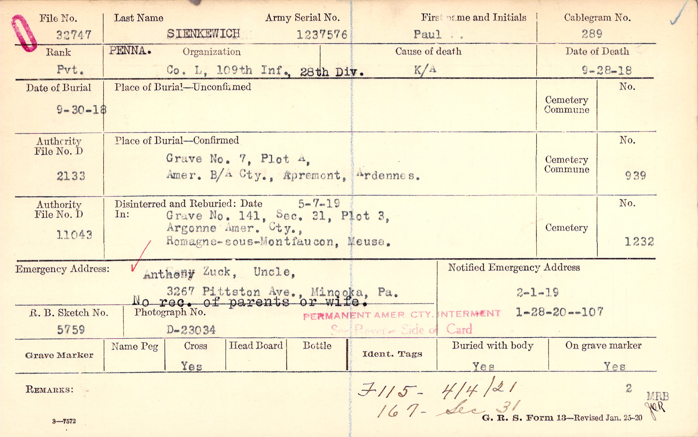 Anthony Zuck, Uncle,, 3267 Pittston Ave., Minooka, Pa., No rec. of parents or wife.