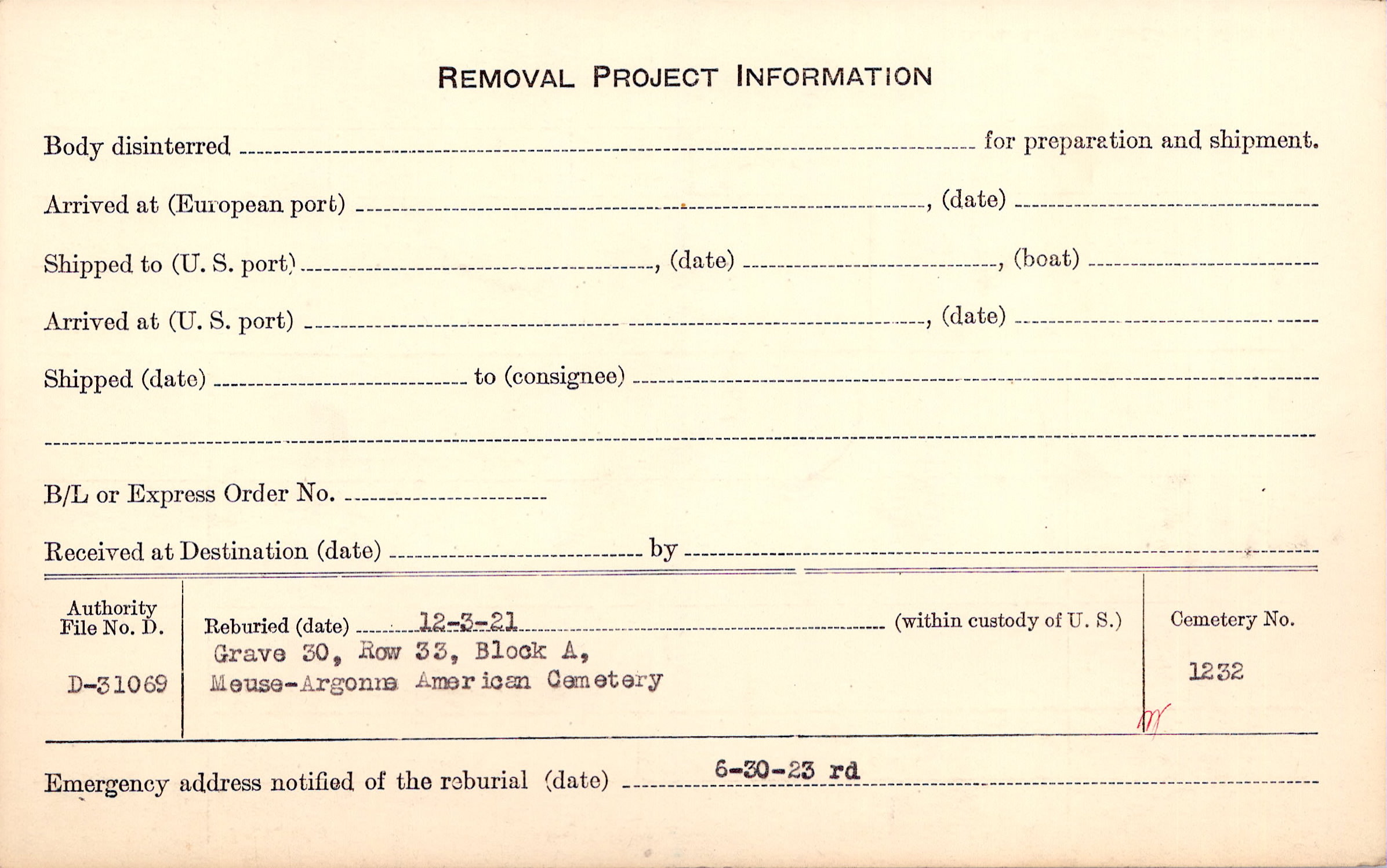 | Permanent Burial in Foreign Cemetery |