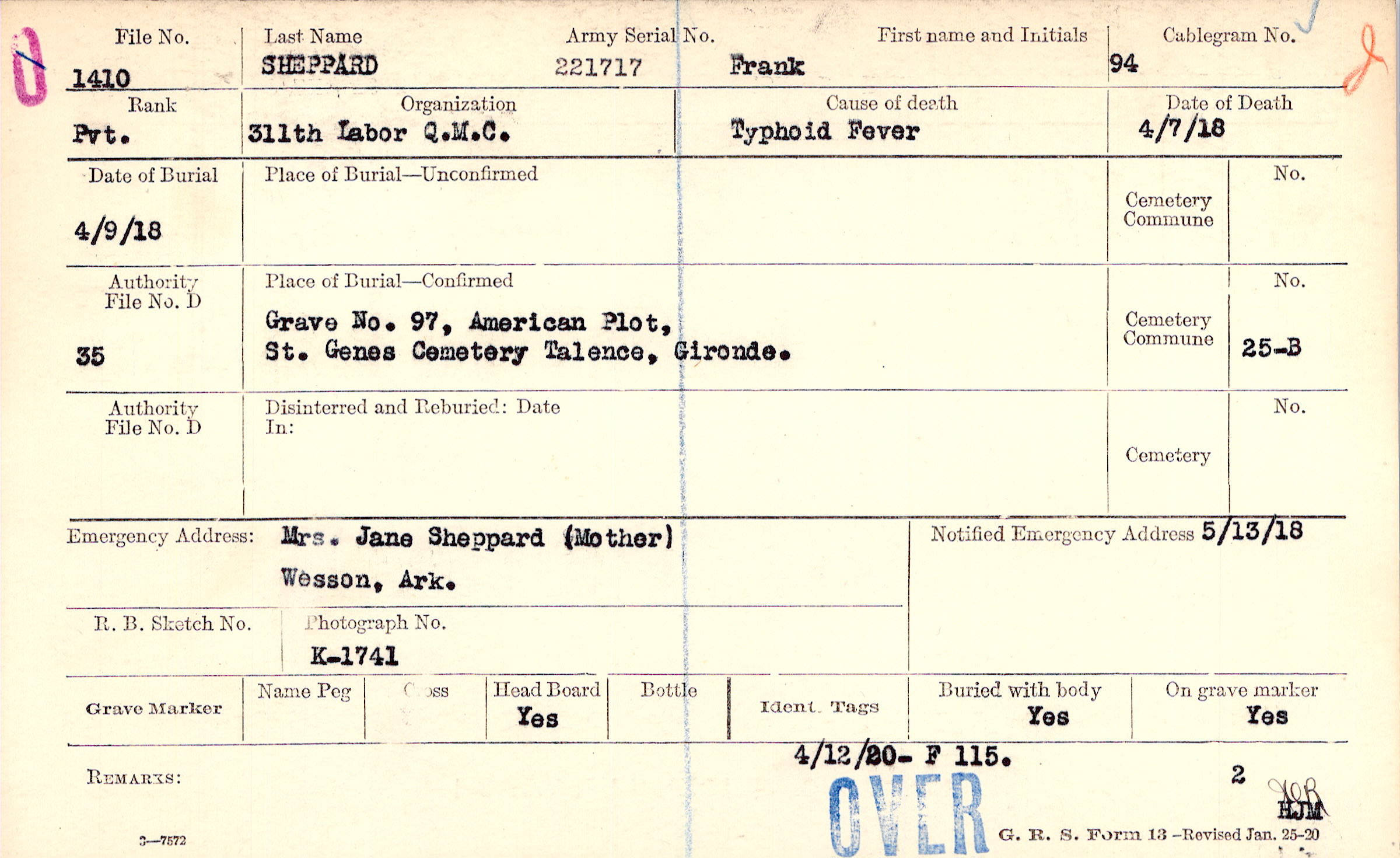 Grave 97, American Plot, St. Genes Cemetery, Talence, Gironde