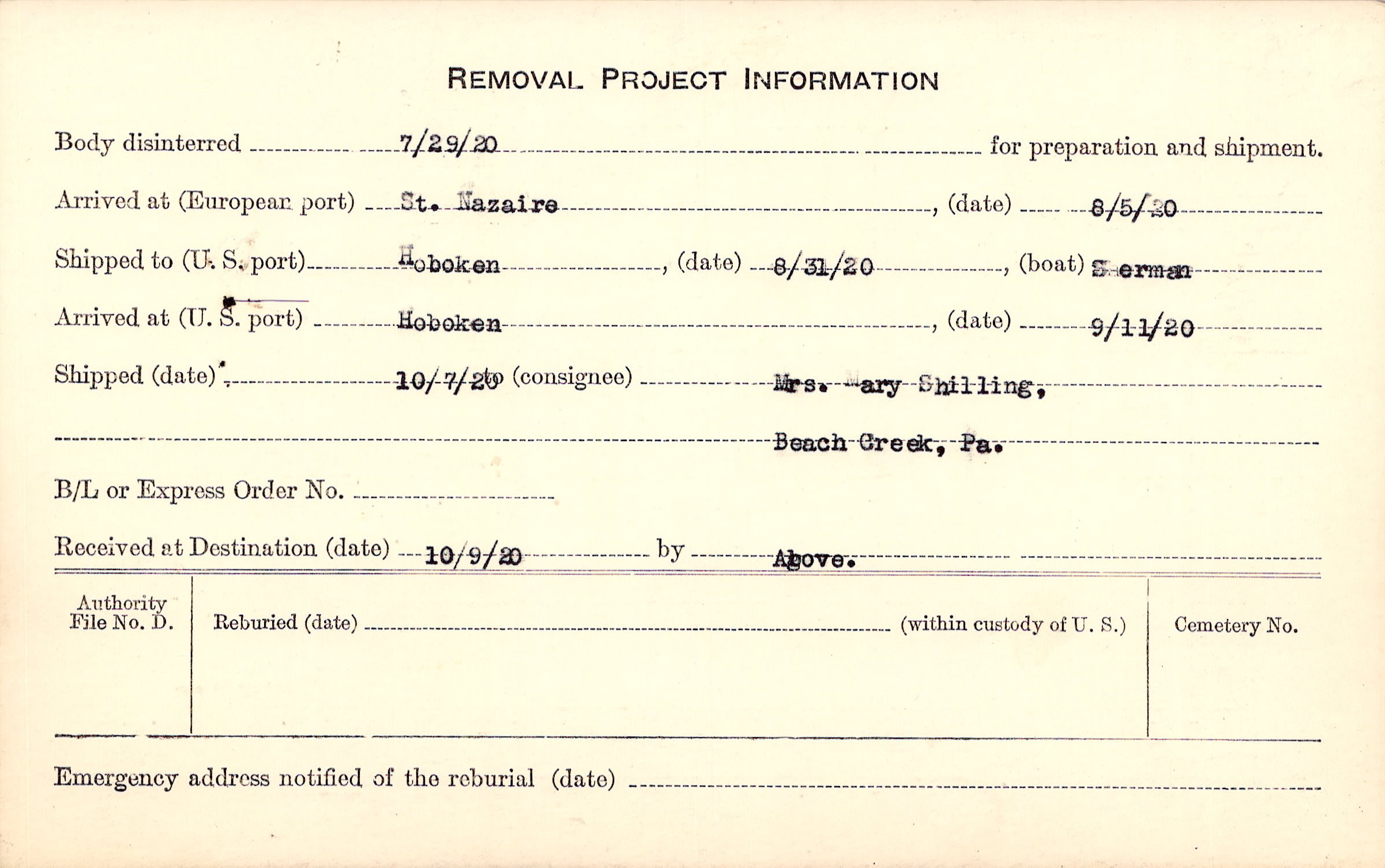 Body disinterred 7/29/1920 for preparation and shipment.