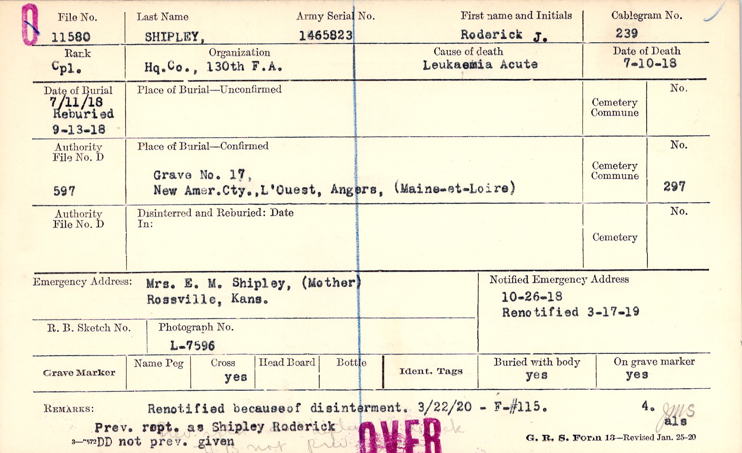 7/11/1918, Reburied 9/13/1918