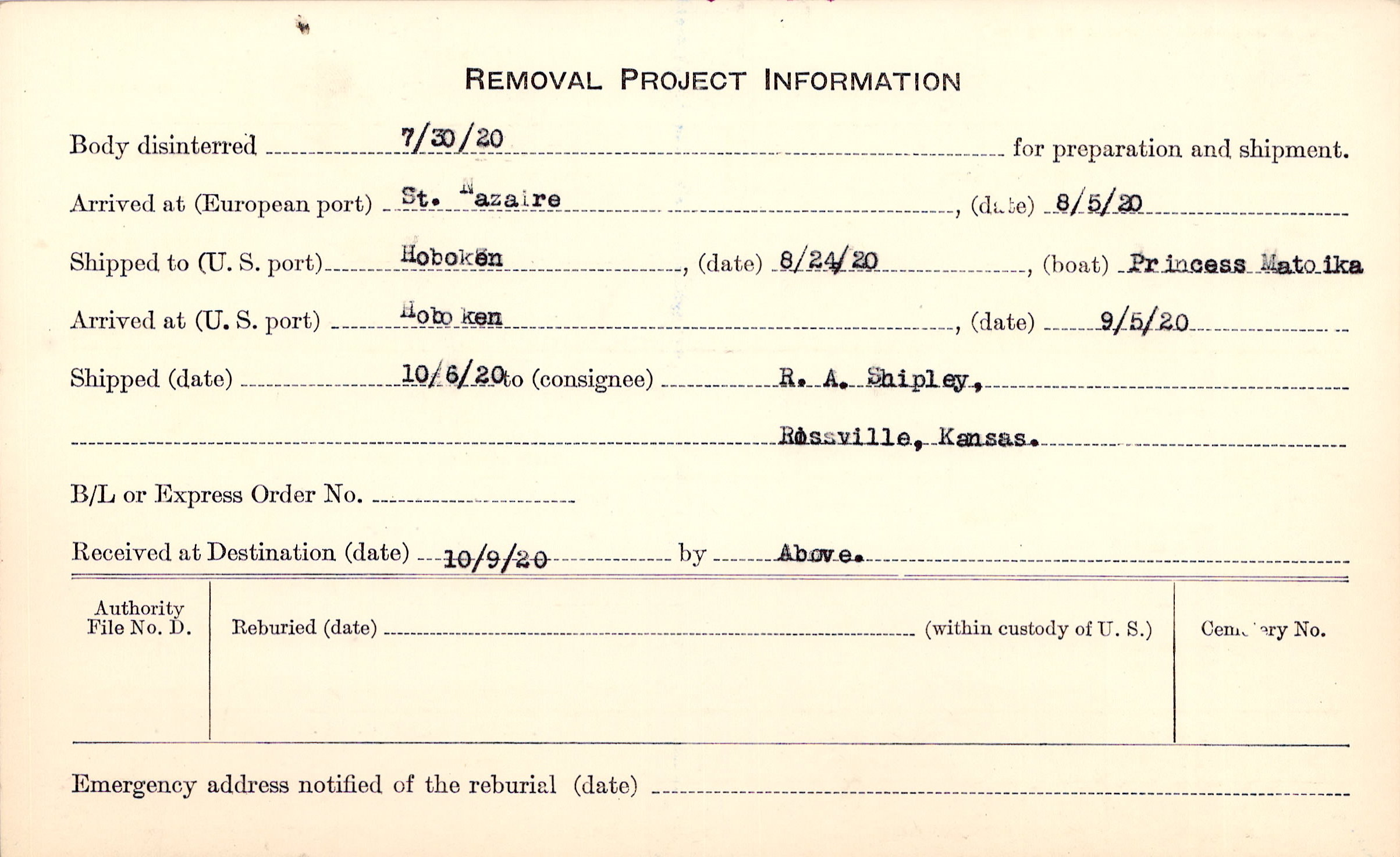 Body disinterred 7/30/1920 for preparation and shipment.