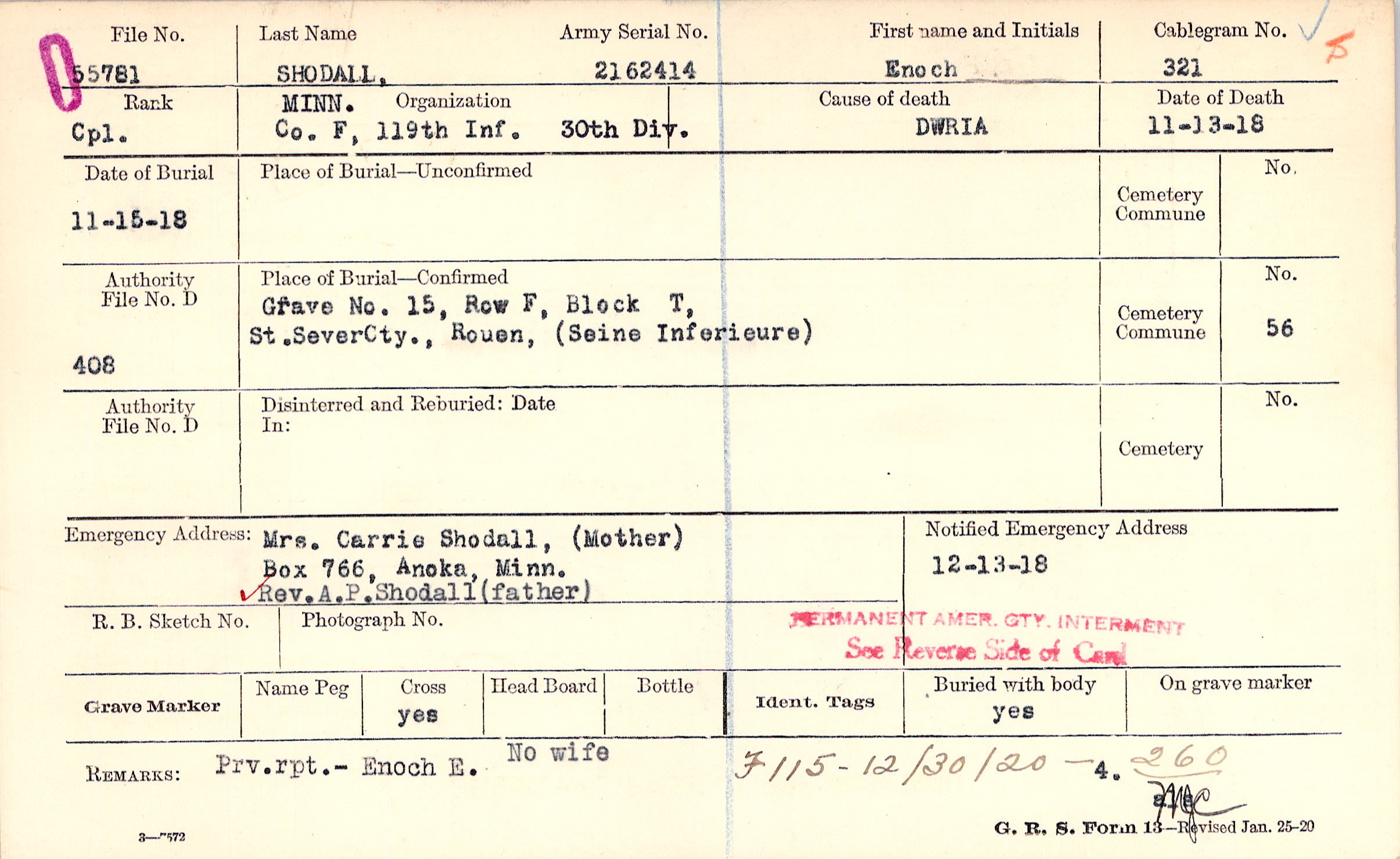 Mrs. Carrie Shodall, (Mother), Box 766, Anoka, Minn., Rev.A.P.Shodall(father)