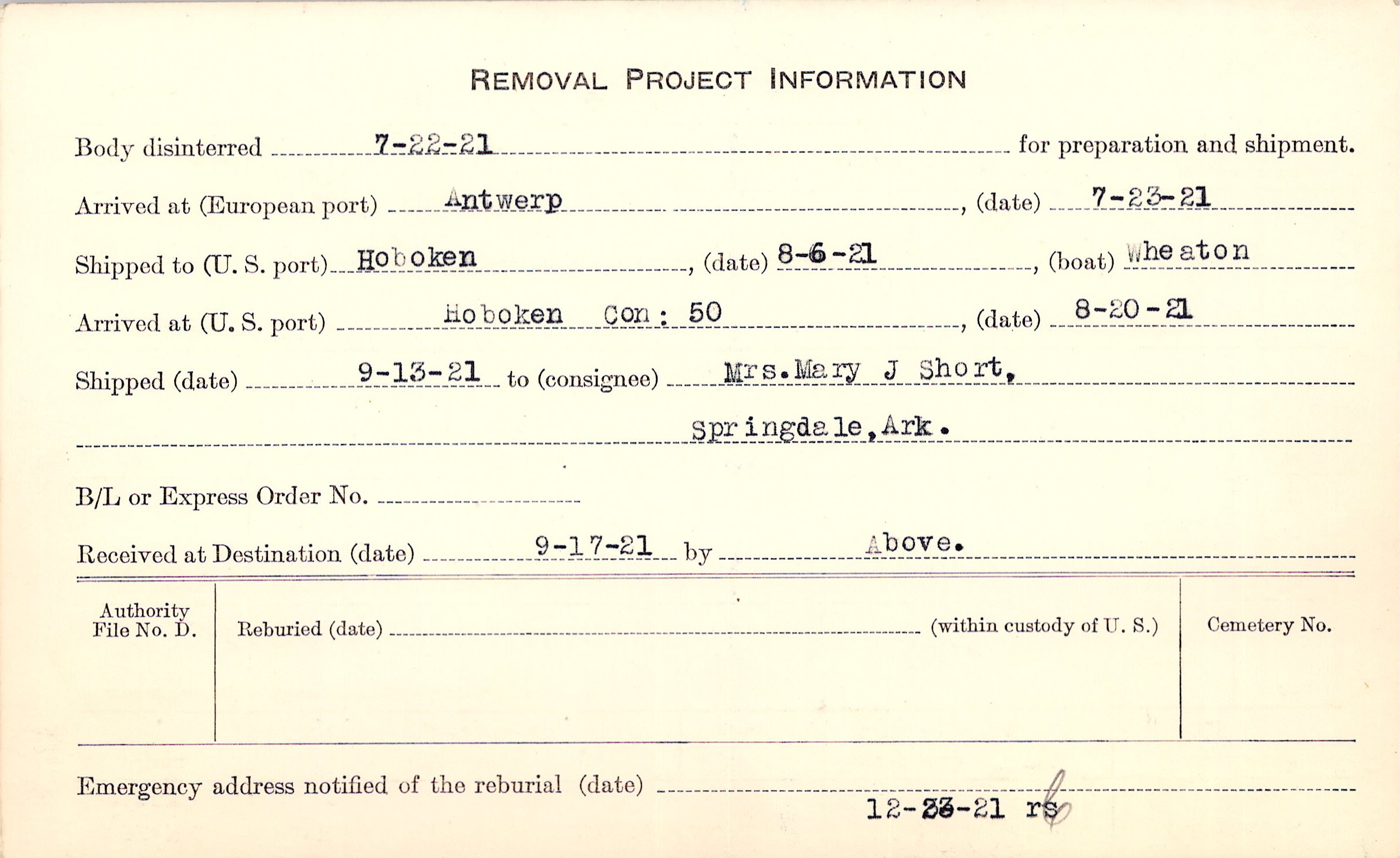 Body disinterred 7/22/1921 for preparation and shipment.