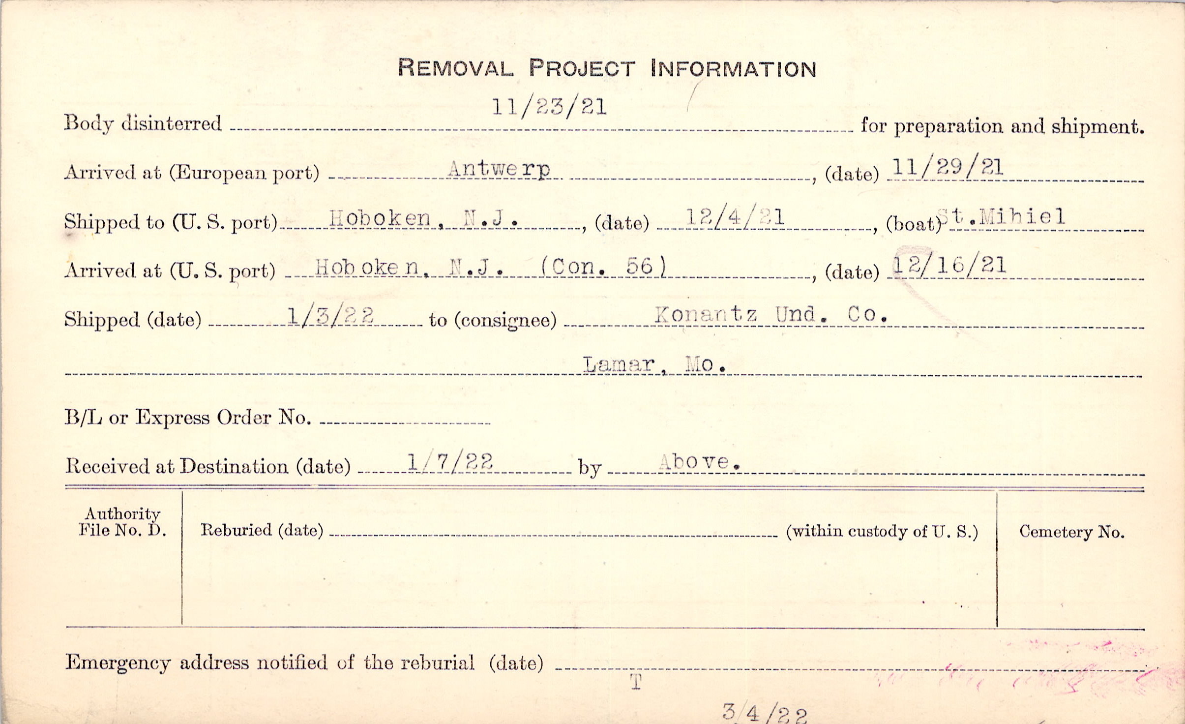 Body disinterred 11/23/1921 for preparation and shipment.