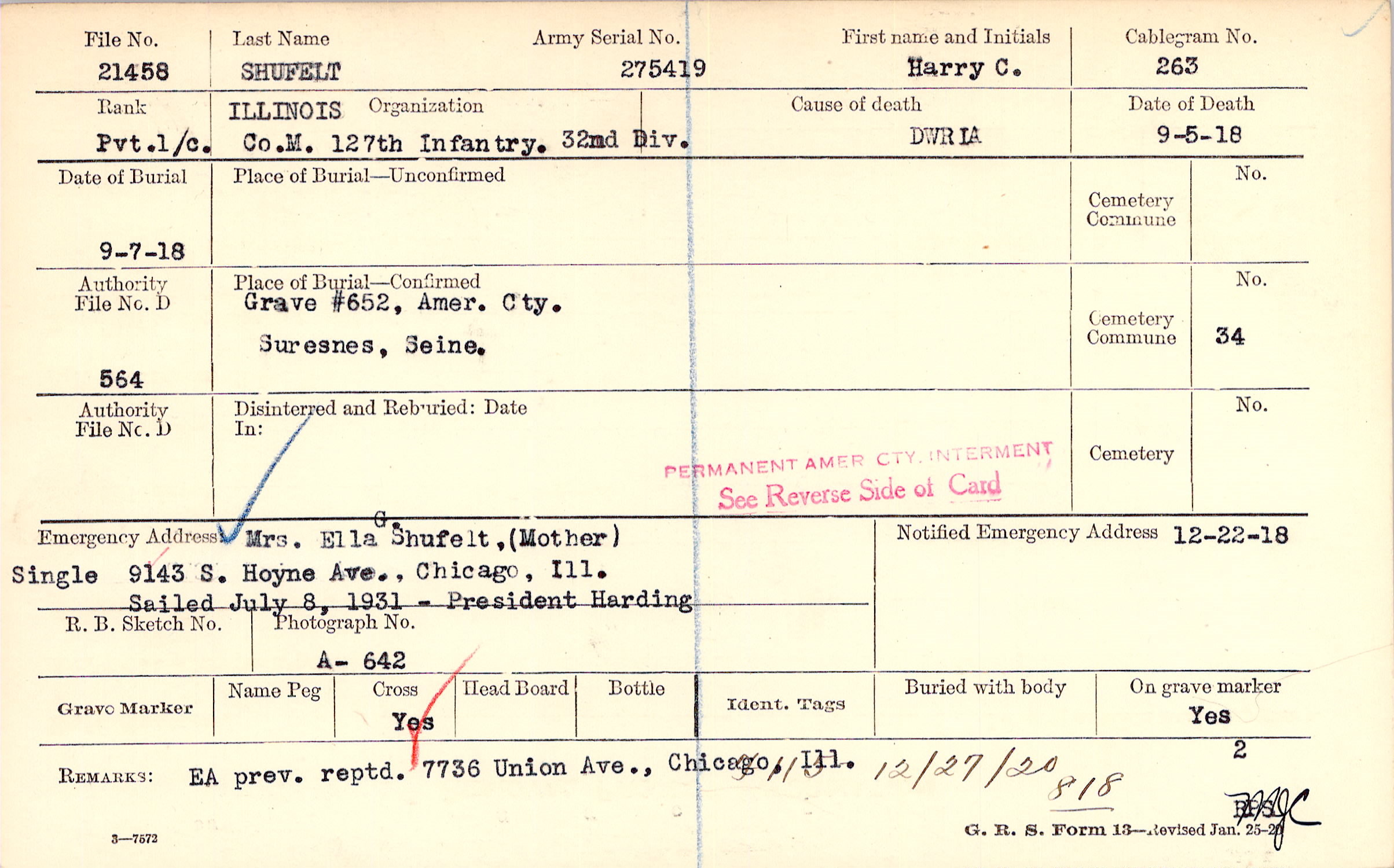 Mrs. Ella G. Shufelt, (Mother), 9143 S. Hoyne Ave., Chicago, Ill., Single Sailed July 8, 1931 - President Harding