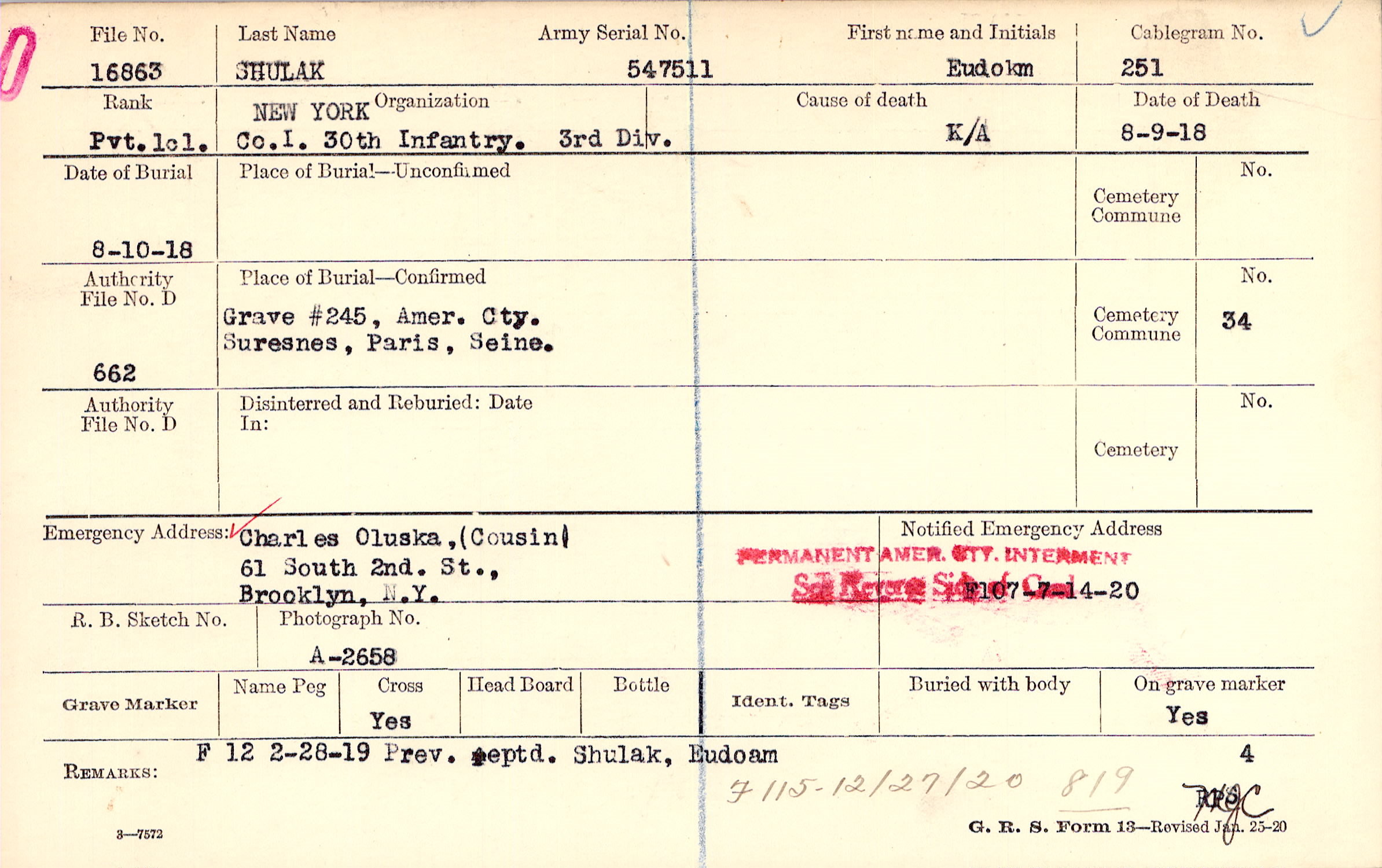 Grave #245, Amer. Cty., Suresnes, Paris, Seine.