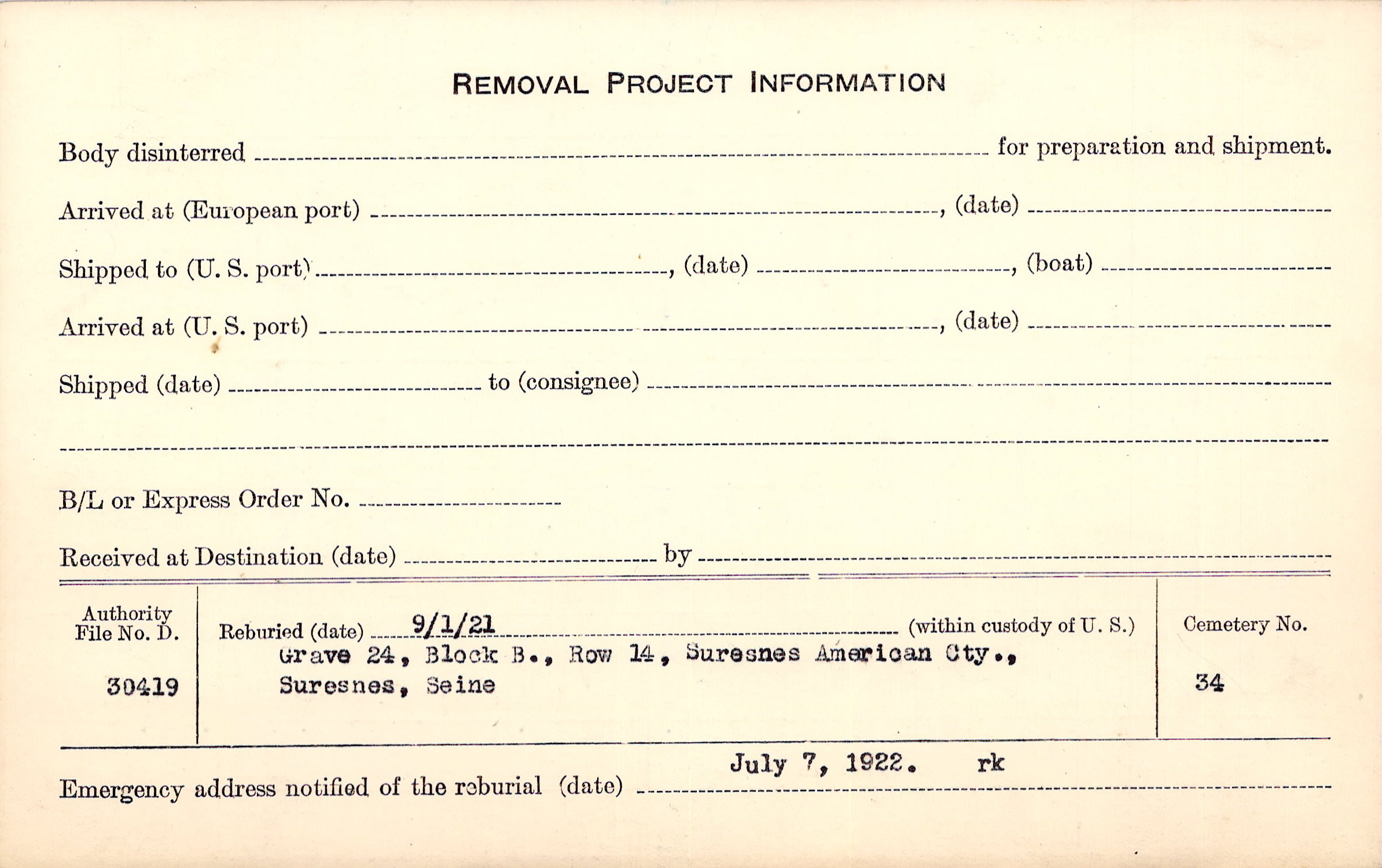 | Permanent Burial in Foreign Cemetery |