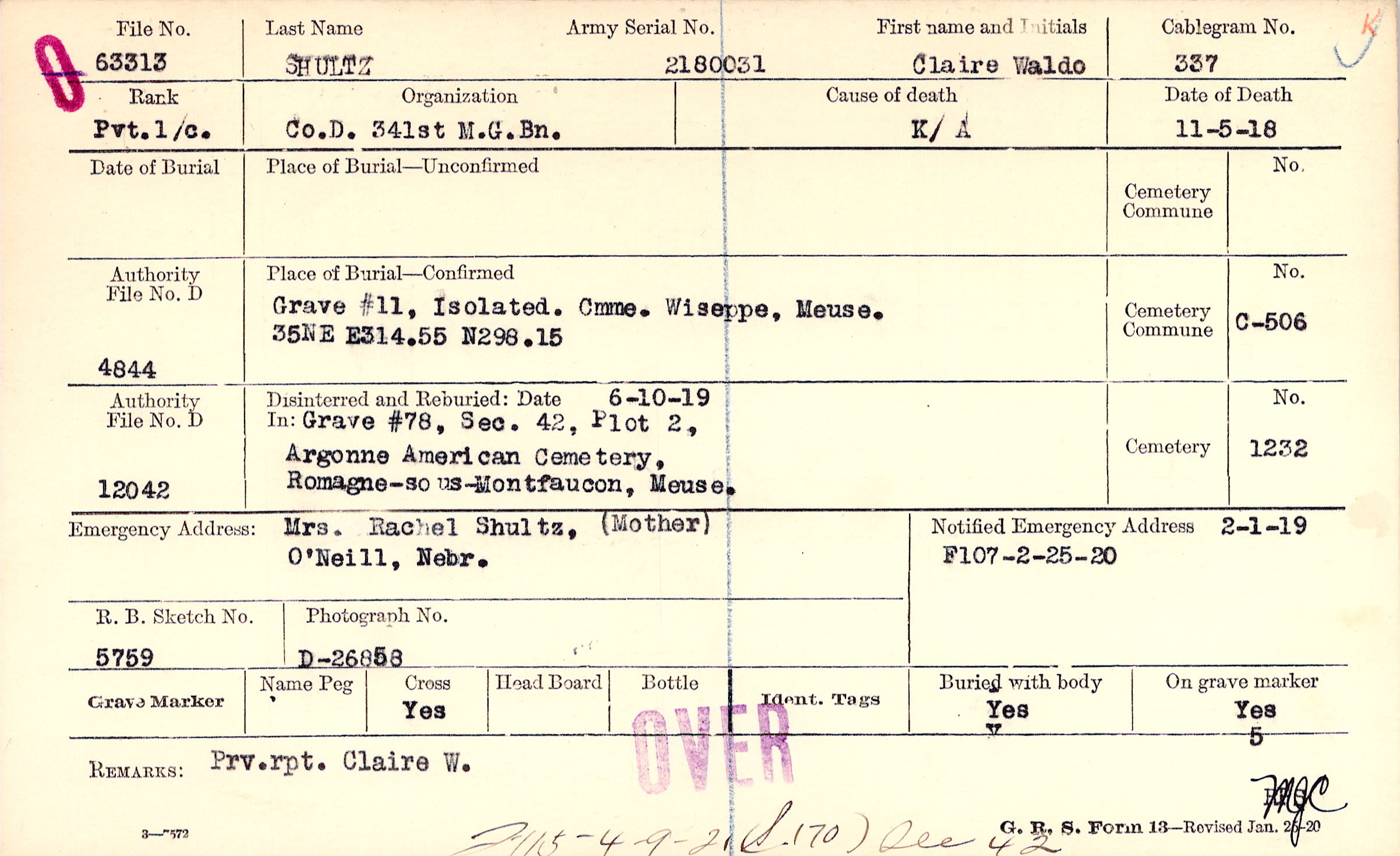 Mrs. Rachel Shultz, (Mother), O'Neill, Nebr.