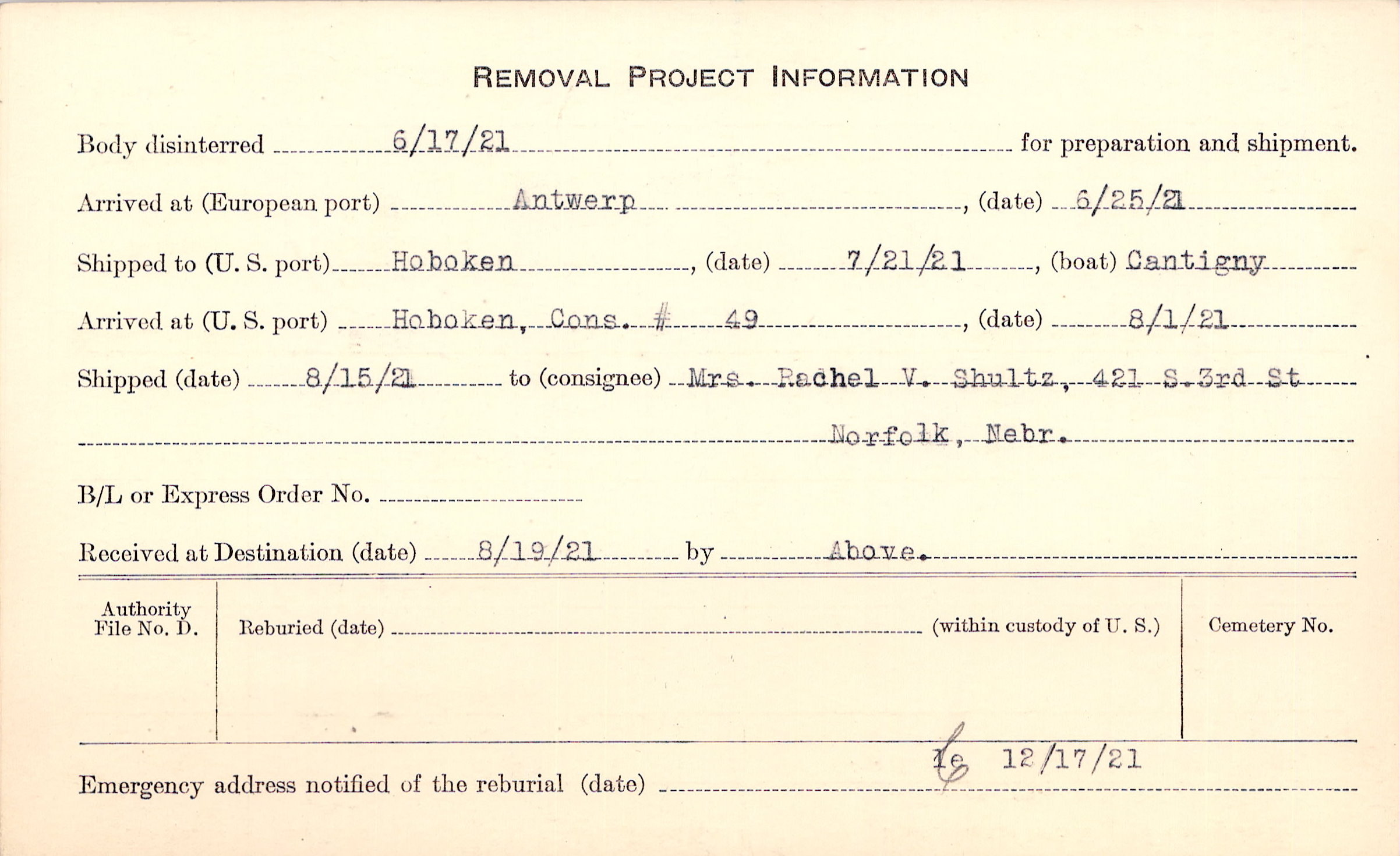 to Mrs. Rachel V. Shultz, 421 S. 3rd St., Norfolk, Nebr.