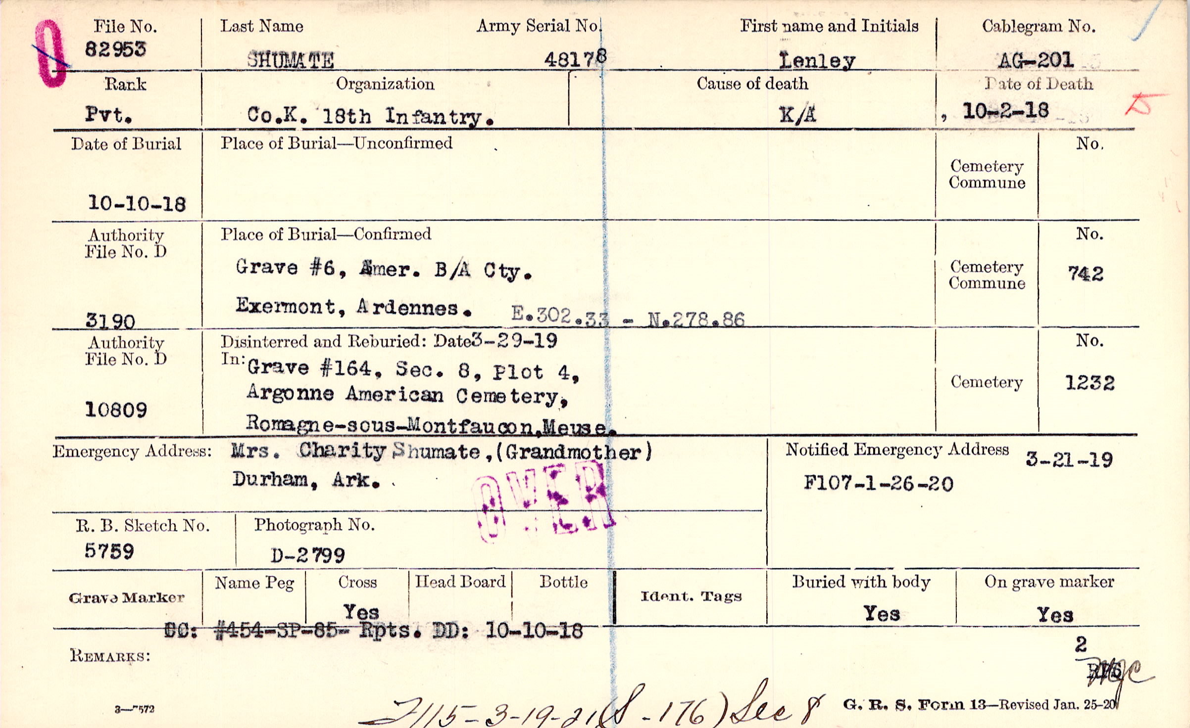 Grave 164, Section 8, Plot 4, Argonne American Cemetery, Romagne-sous-Montfaucon, Meuse