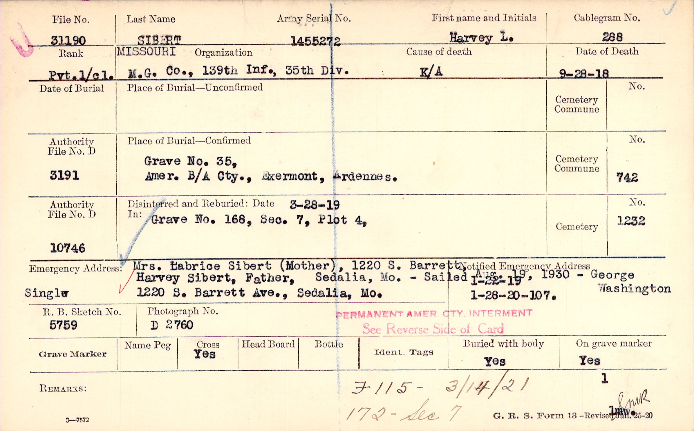 Grave 35, Amer. B/A Cty., Exermont, Ardennes.