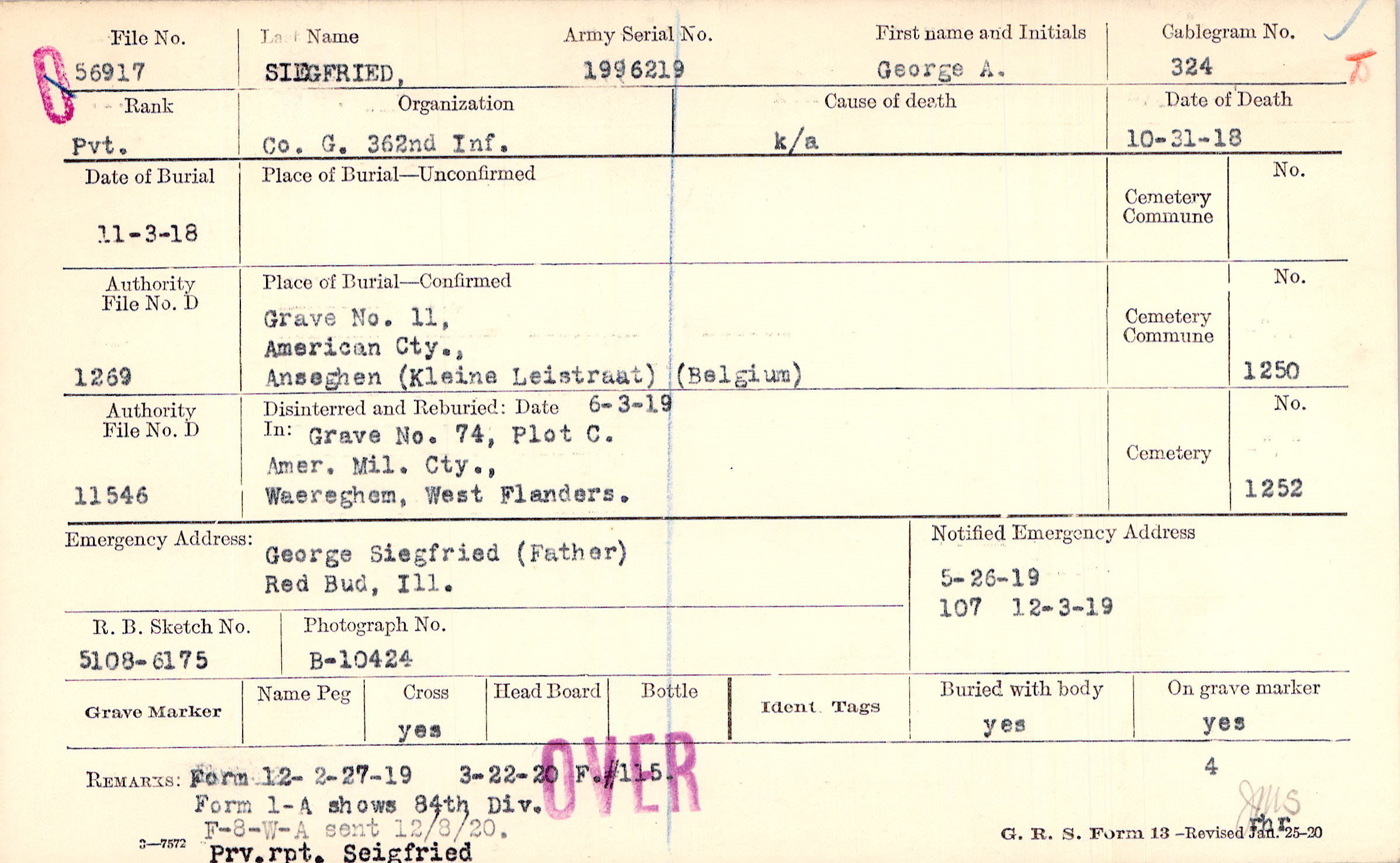 Form 1-A shows 84th Div. Prv. rpt. Seigfried
