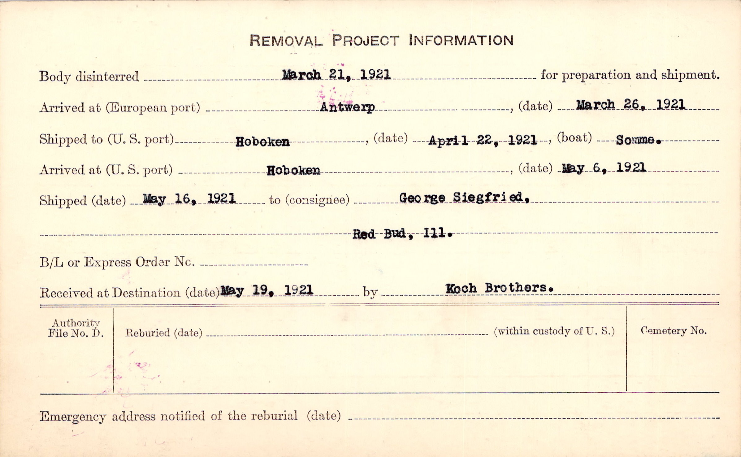 Body disinterred 3/21/1921 for preparation and shipment.