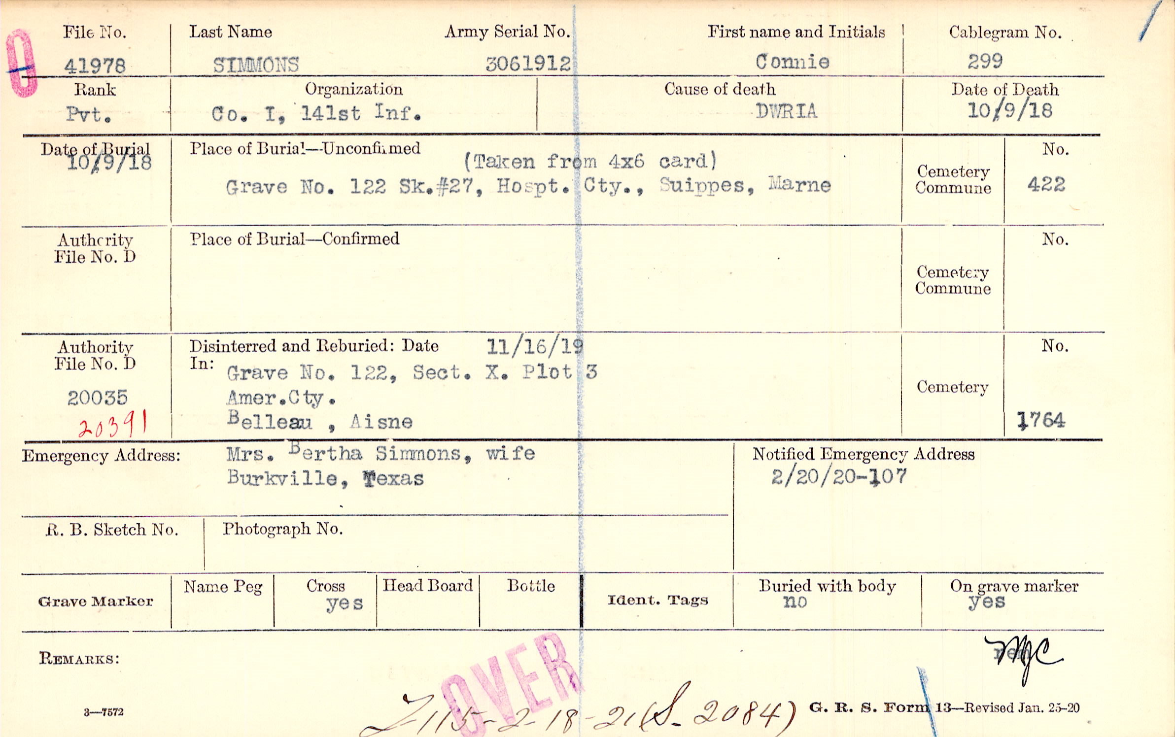 Grave 122, Section X, Plot 3, American Cemetery, Belleau, Aisne