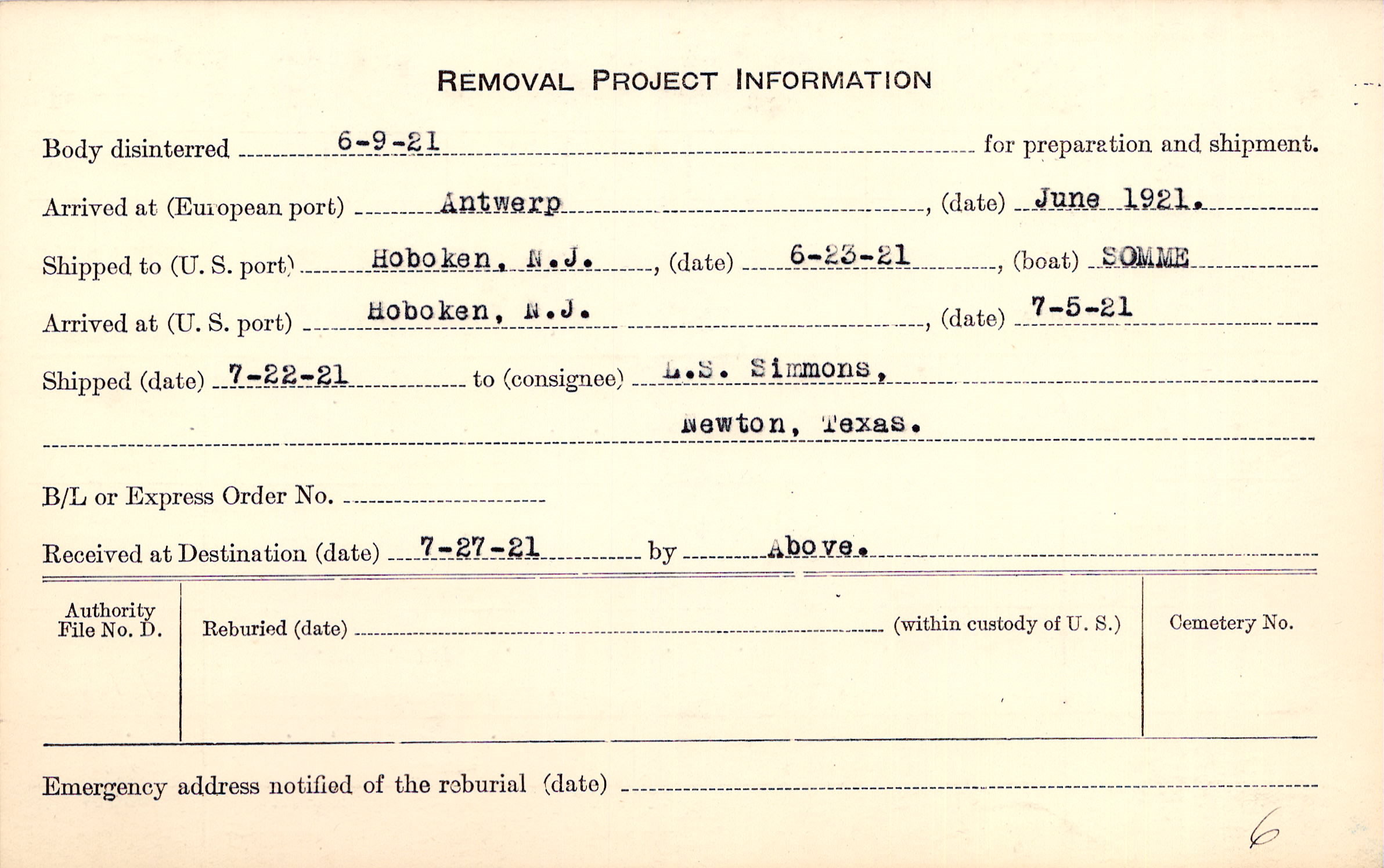 Body disinterred 6/9/1921 for preparation and shipment.