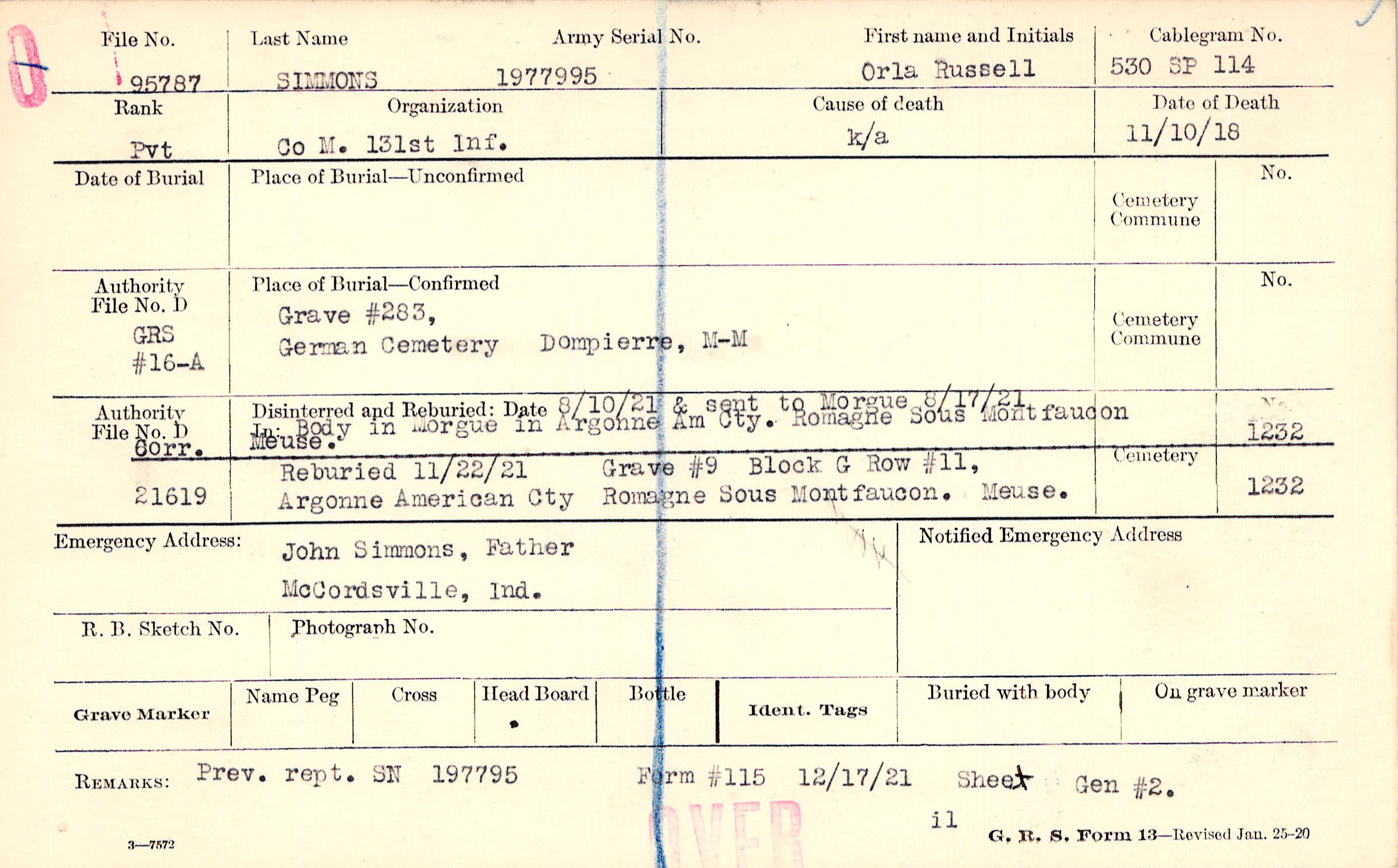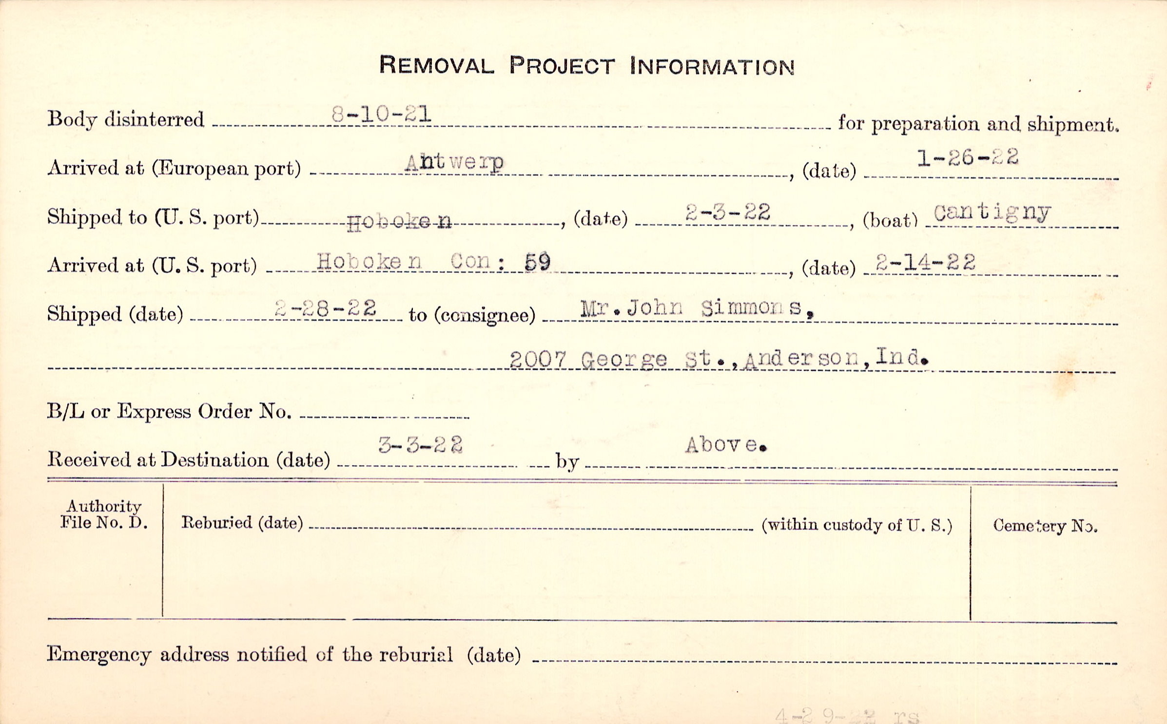 Body disinterred 8/10/1921 for preparation and shipment.