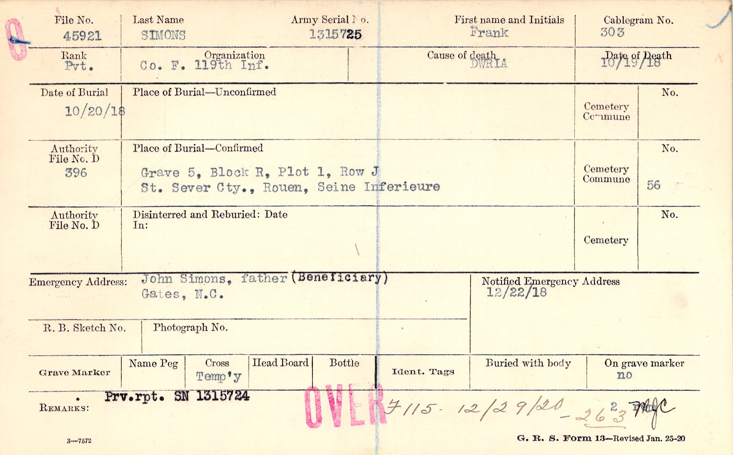 Grave 5, Block R, Plot 1, Row J, St. Sever Cty., Rouen, Seine Inferieure