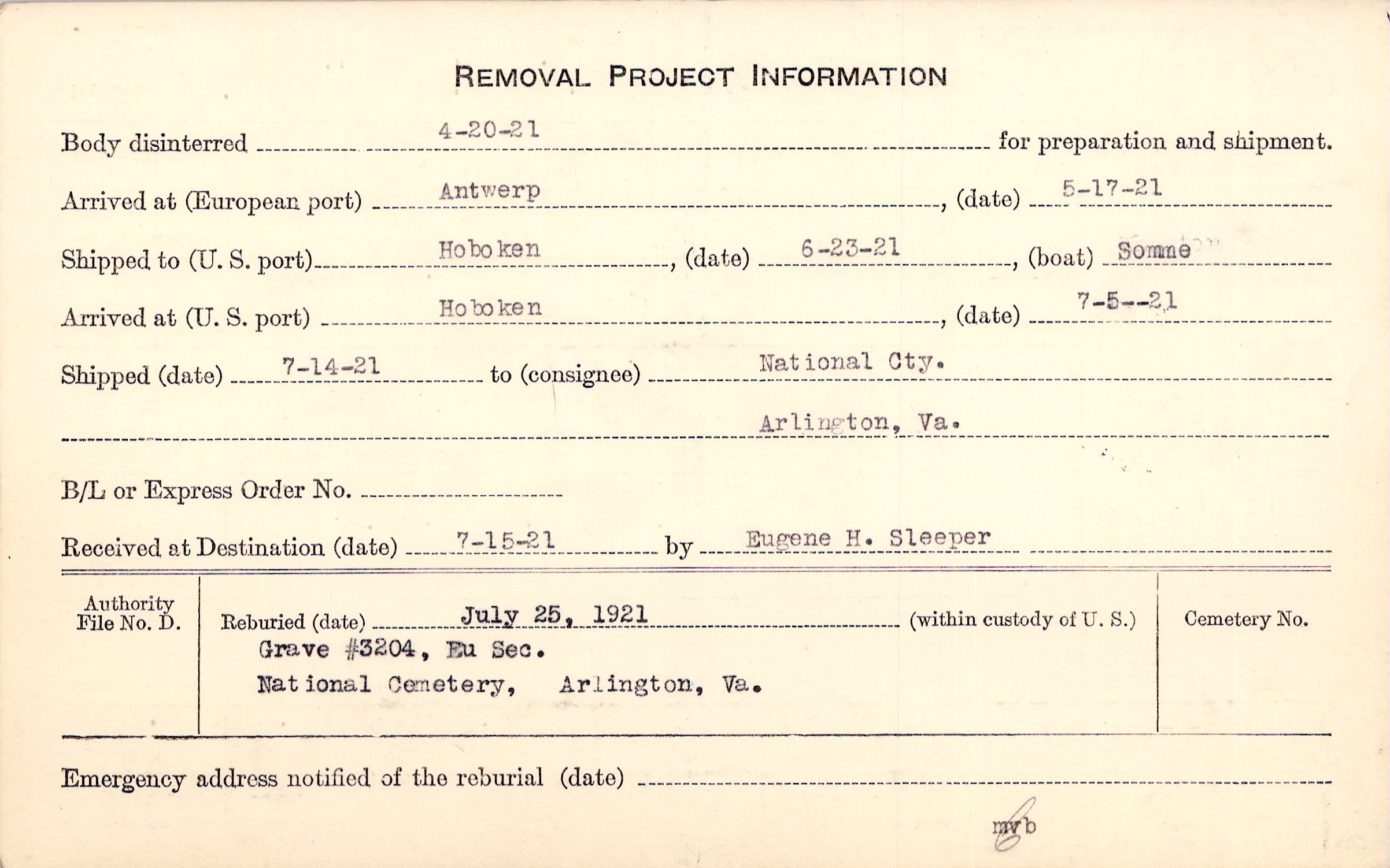 Body disinterred 4/20/1921 for preparation and shipment.