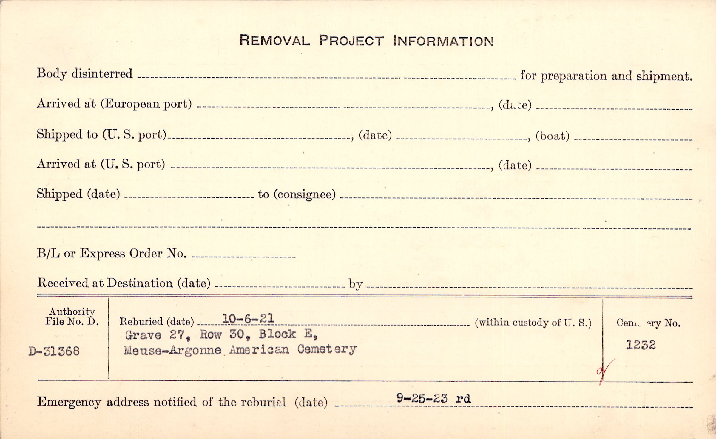 | Permanent Burial in Foreign Cemetery |