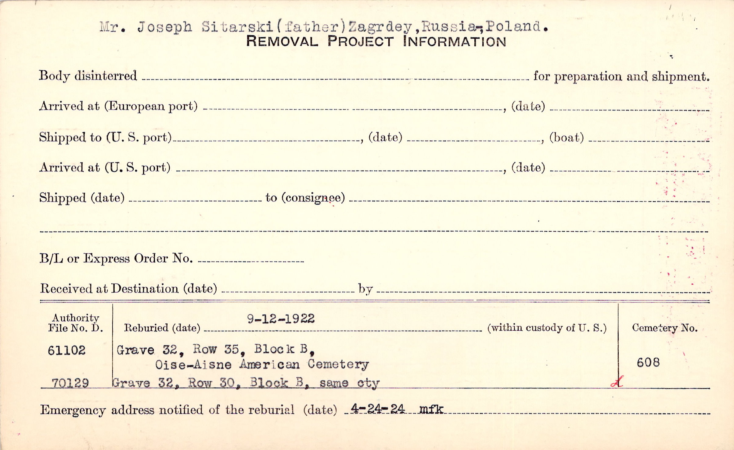 Mr. Joseph Sitarski (father) Zagrdey, Russia, Poland. |