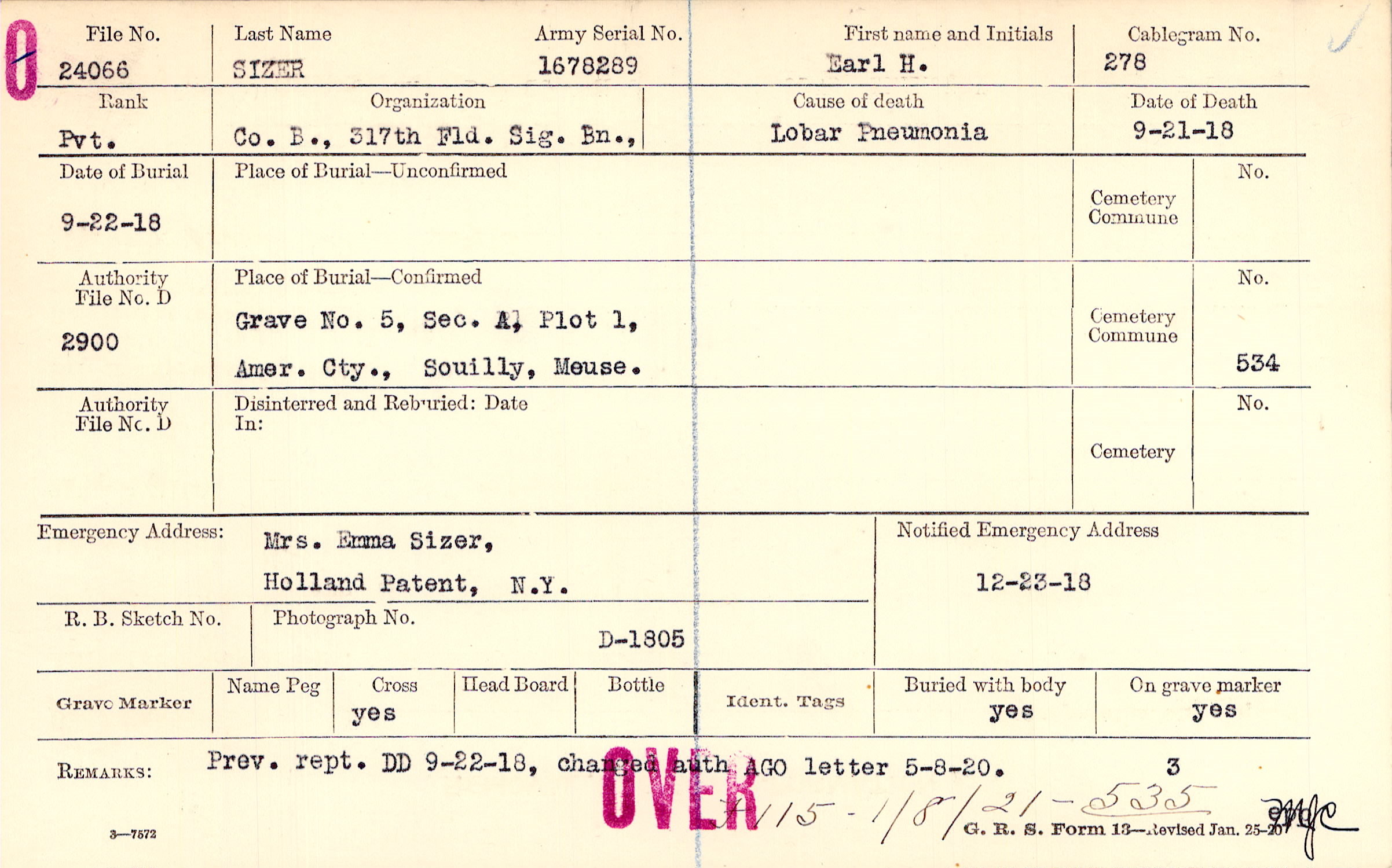 Grave 5, Sec. A, Plot 1,Amer. Cty., Souilly, Meuse.
