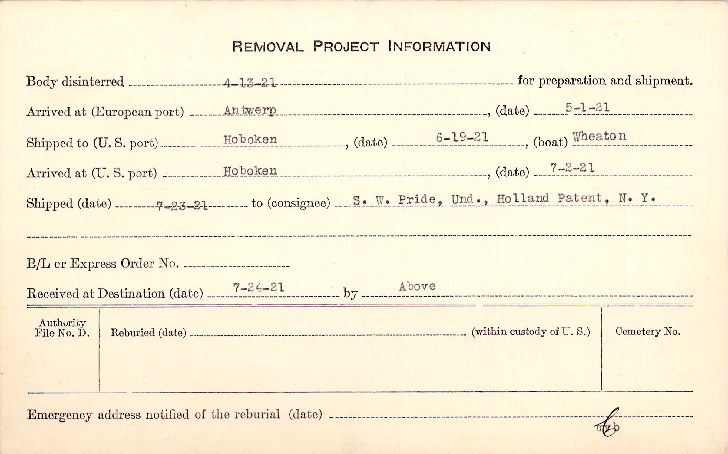 Body disinterred 4/13/1921 for preparation and shipment.