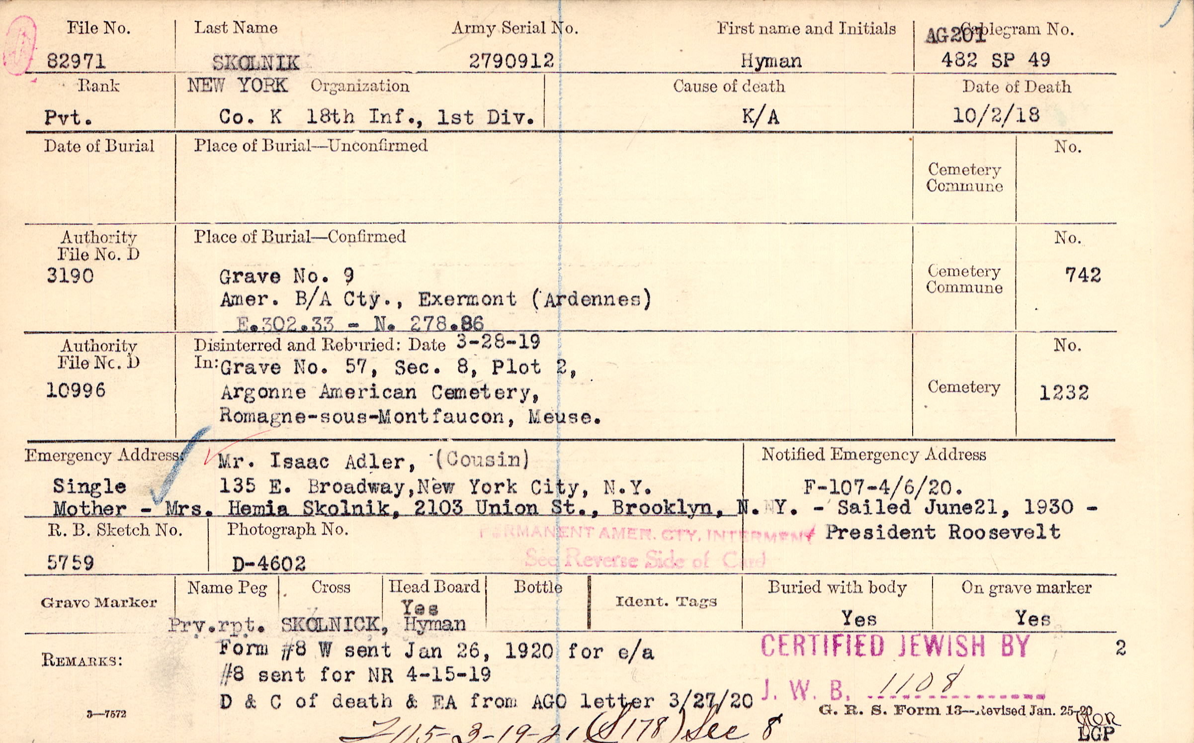 CERTIFIED JEWISH BY J. W. B. 1108, 4-15-19Form #8 sent for NR Form #8 W sent Jan 26, 1920 for e/a, F115 - 3-19-21 (S178) Sec 8