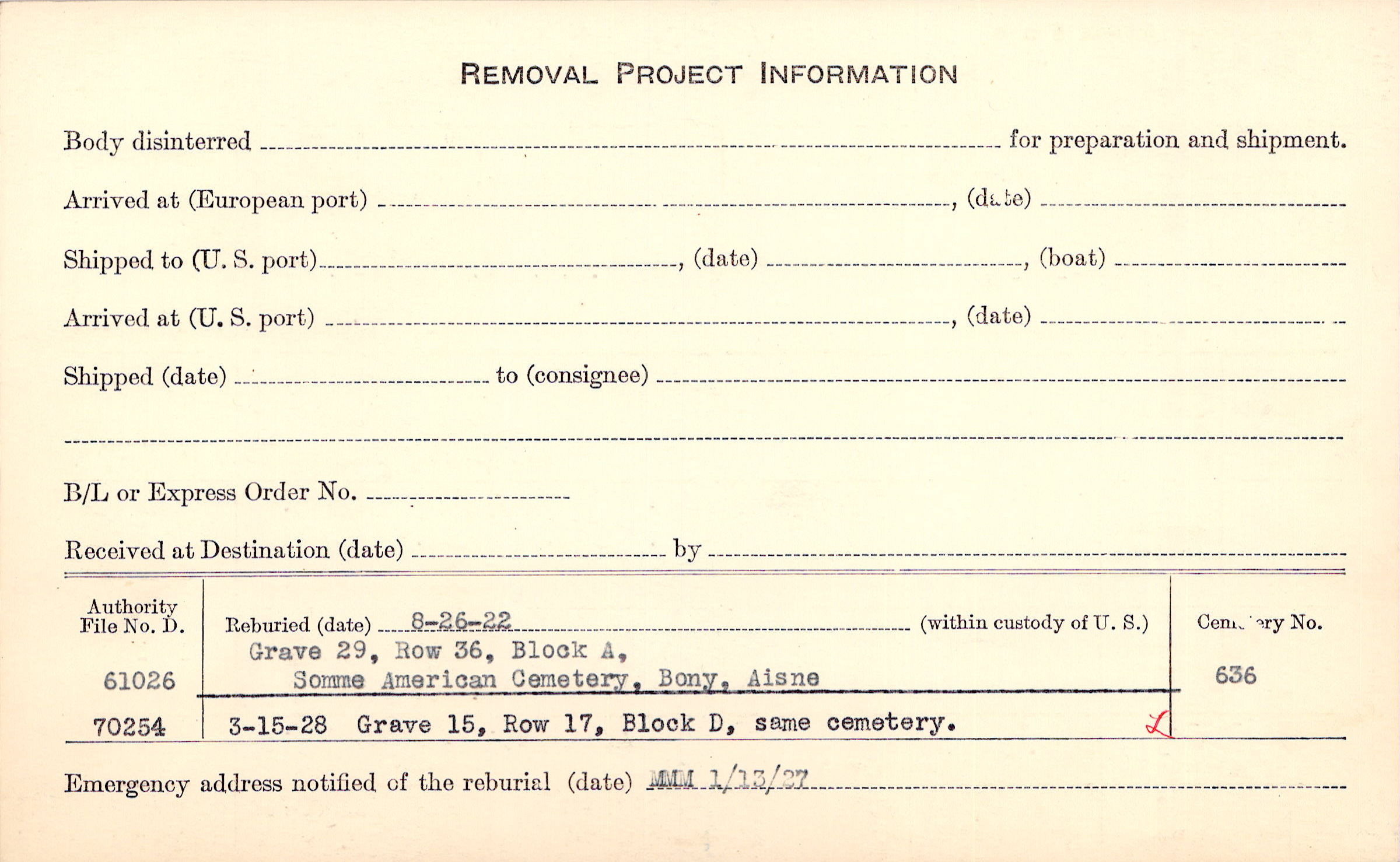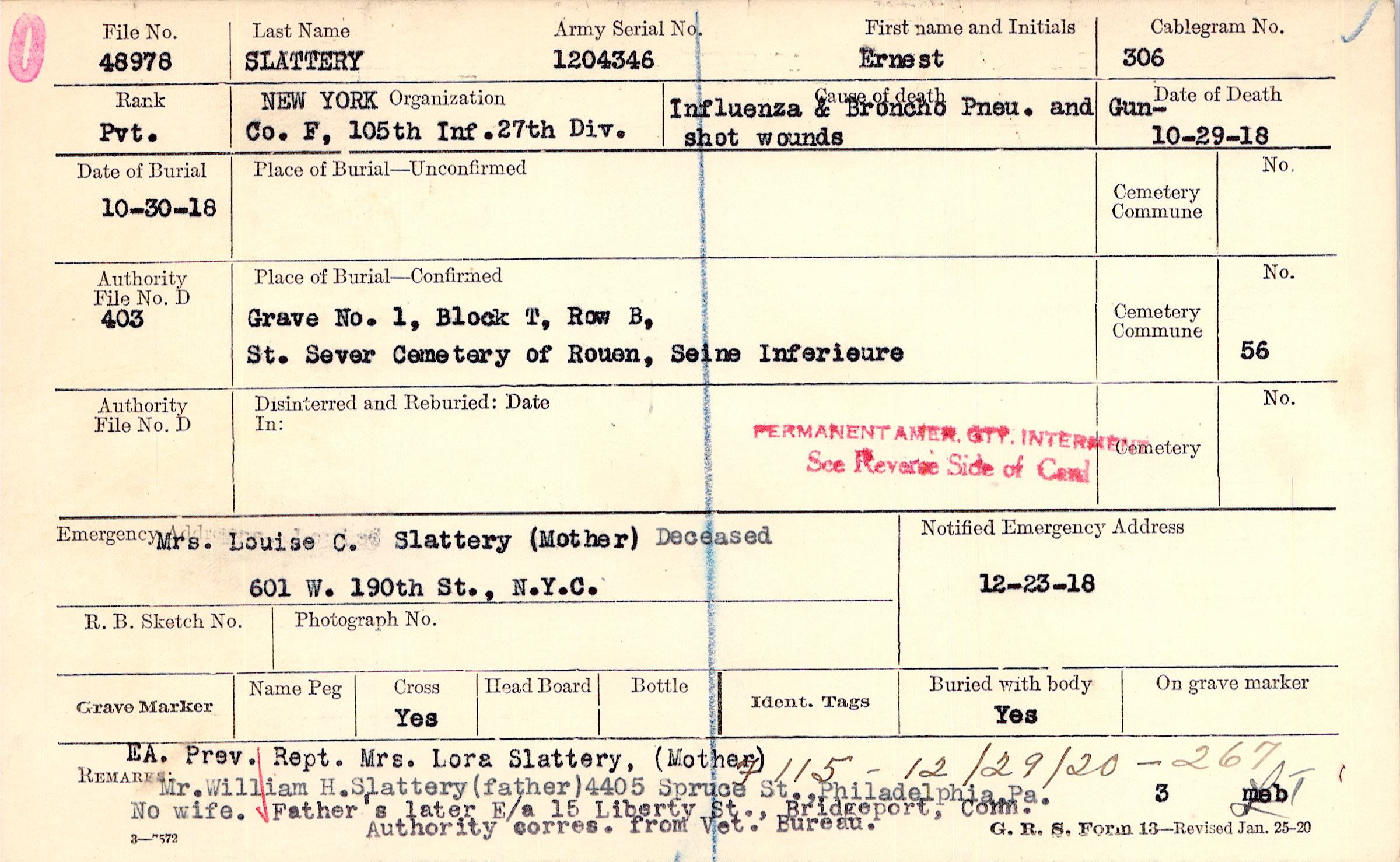 EA. Prev. Rept. Mrs. Lora Slattery, (Mother), Mr. William H. Slattery (father) 4405 Spruce St., Philiadelphia, Pa. , no wife. Father's later E/a 15 Liberty St., Bridgeport, Conn., Authority corres. from Vet. Bureau., F115 - 12/29/20 - 267