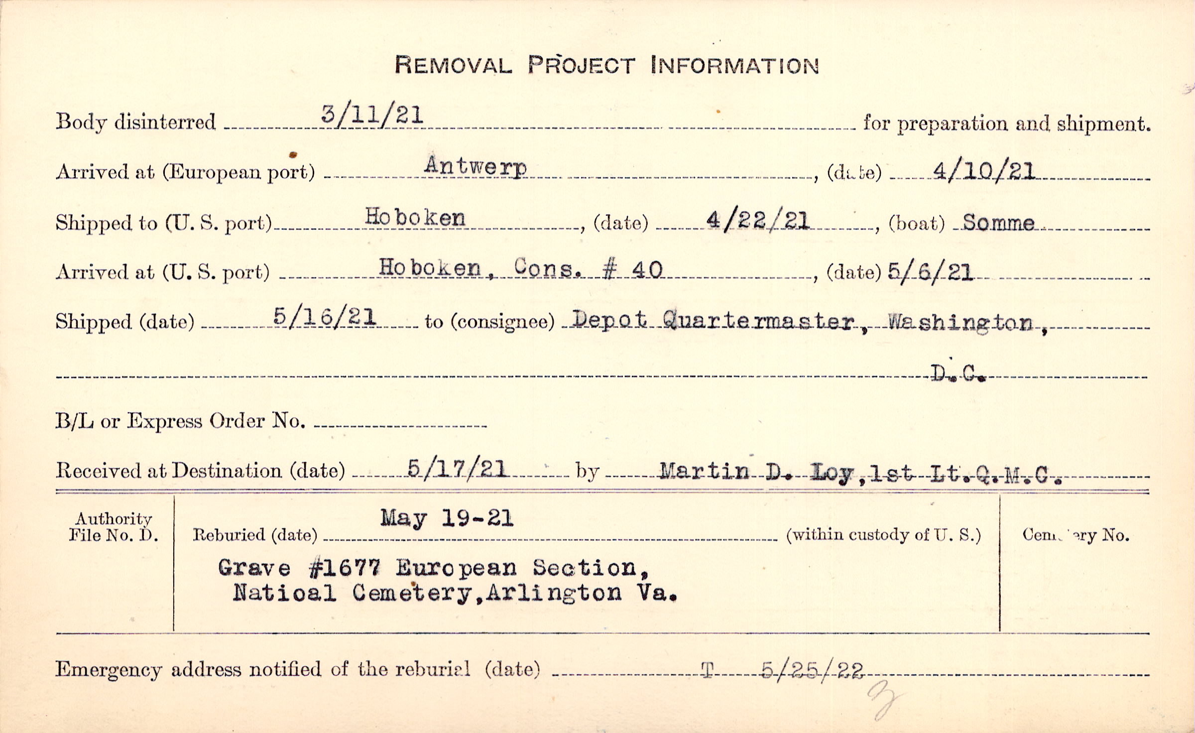 Body disinterred 3/11/1921 for preparation and shipment.