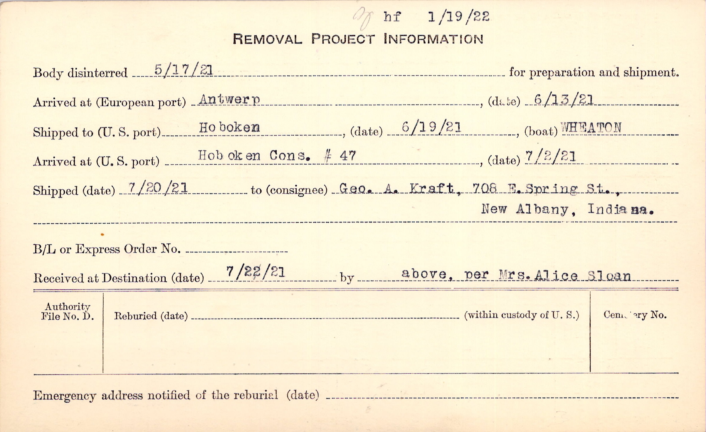 Body disinterred 5/17/1921 for preparation and shipment.