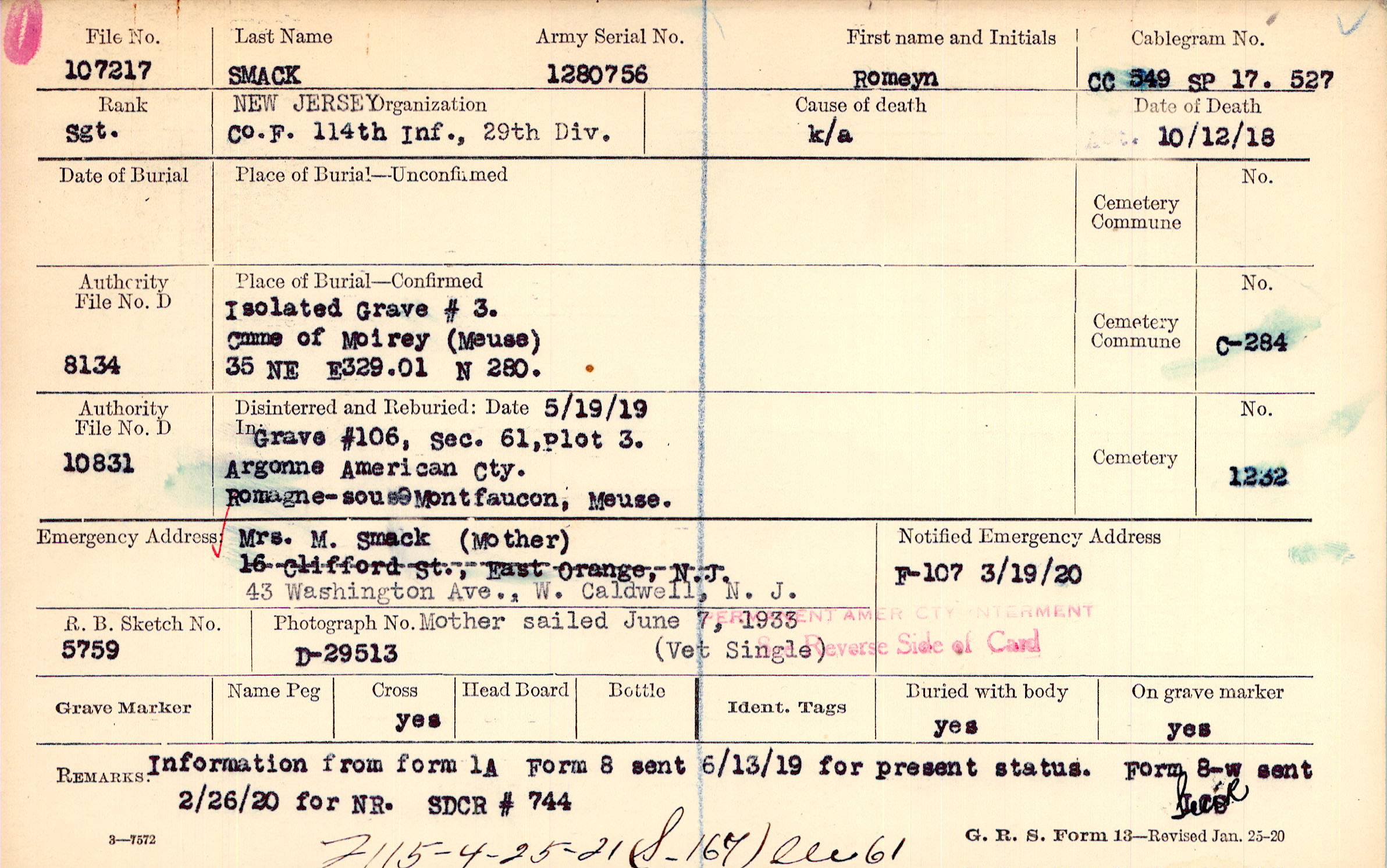 Mrs. M. Smack (Mother), 43 Washington Ave., W. Caldwell, N.J., Mother sailed June 7, 1933 (Vet Single)