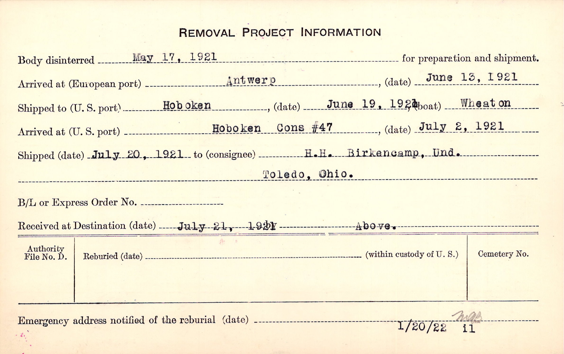 Body disinterred 5/17/1921 for preparation and shipment.