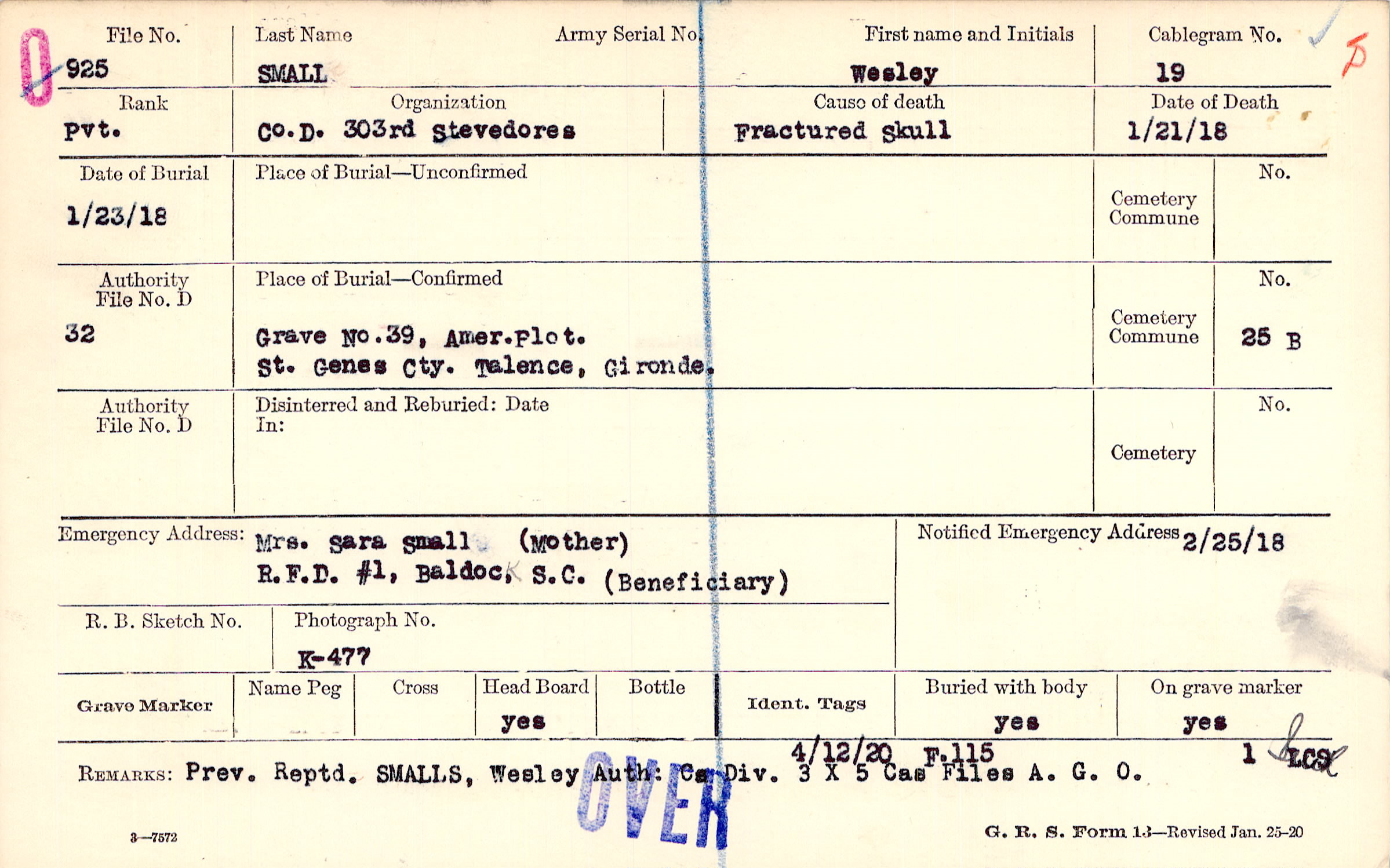 Mrs. Sara Small (Mother), R.F.D. #1 Baldoc, S.C. (Beneficiary), Baldock (Beneficiary)
