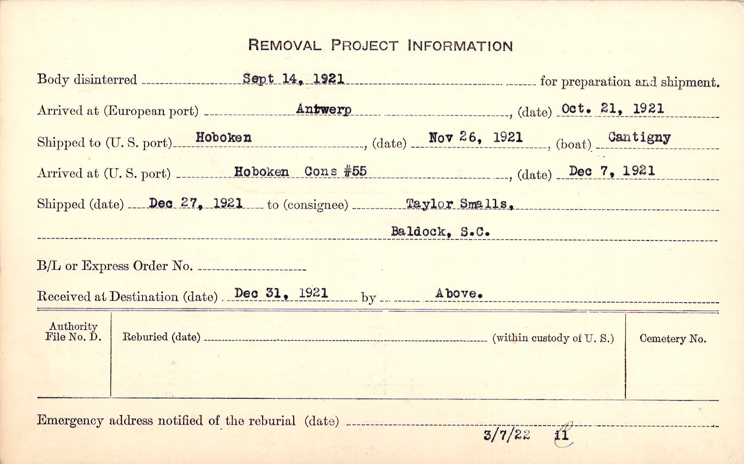 Body disinterred 9/14/1921 for preparation and shipment.
