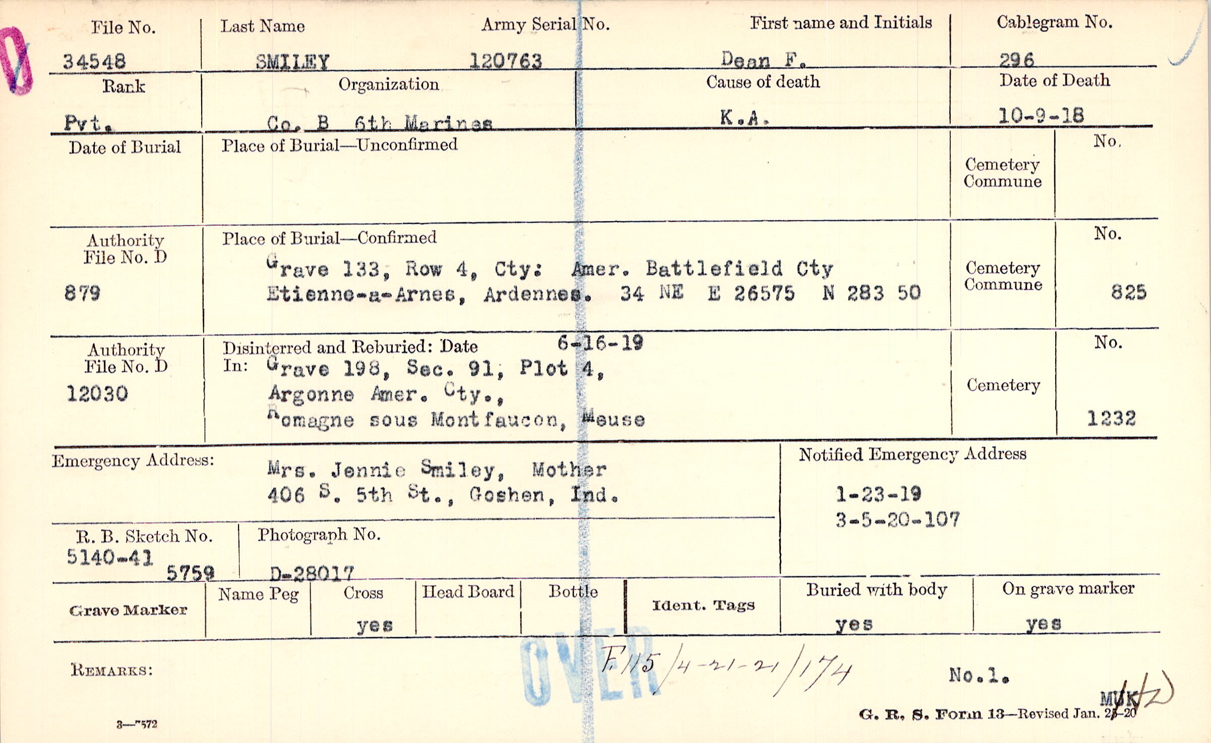Grave 198, Section 91, Plot 4, Argonne American Cemetery, Romagne-sous-Montfaucon, Meuse